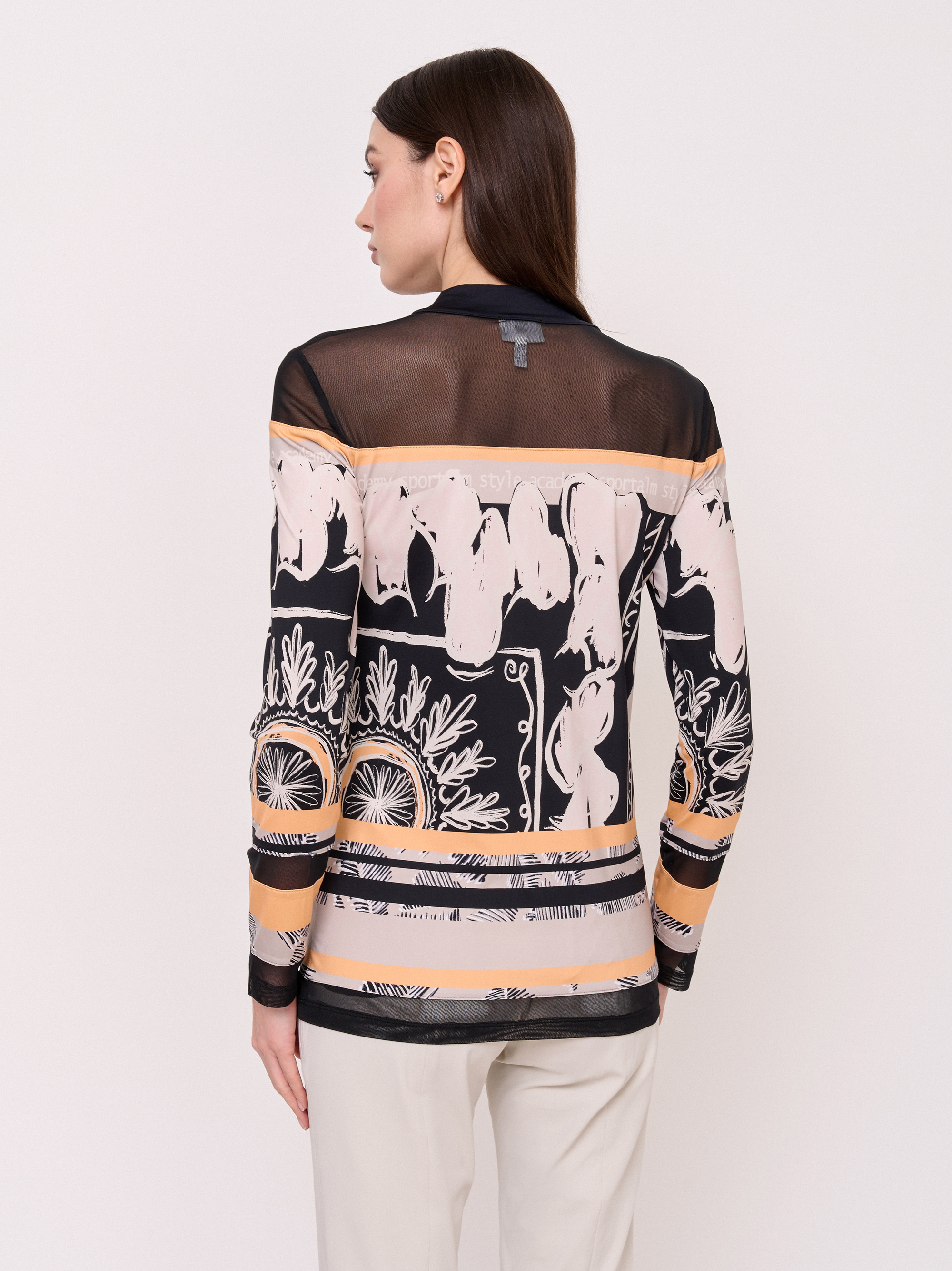 Детали: вырез горловины воротник-стойка, рукава длинные, покрой полуприталенный, рисунок абстракция. Длина по спинке: 65 см.