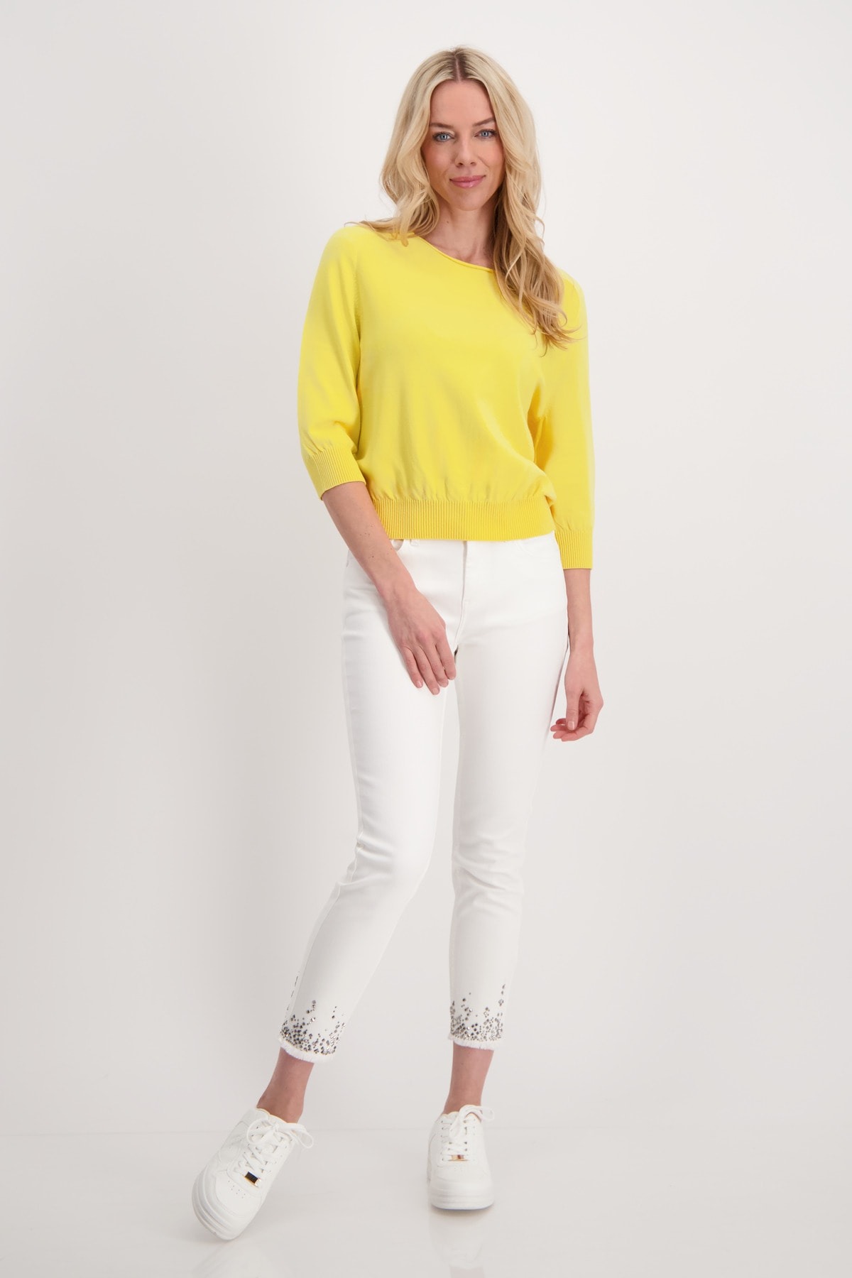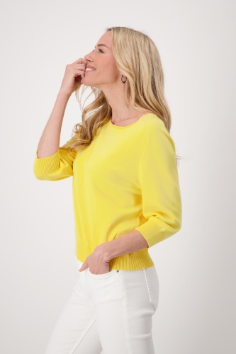 Стильный свитер из струящейся смесовой вискозы с рукавами реглан 3/4 и гладкой структурой. Круглый вырез. Ребристые манжеты и подол. Длина 44 размера — 56 см.