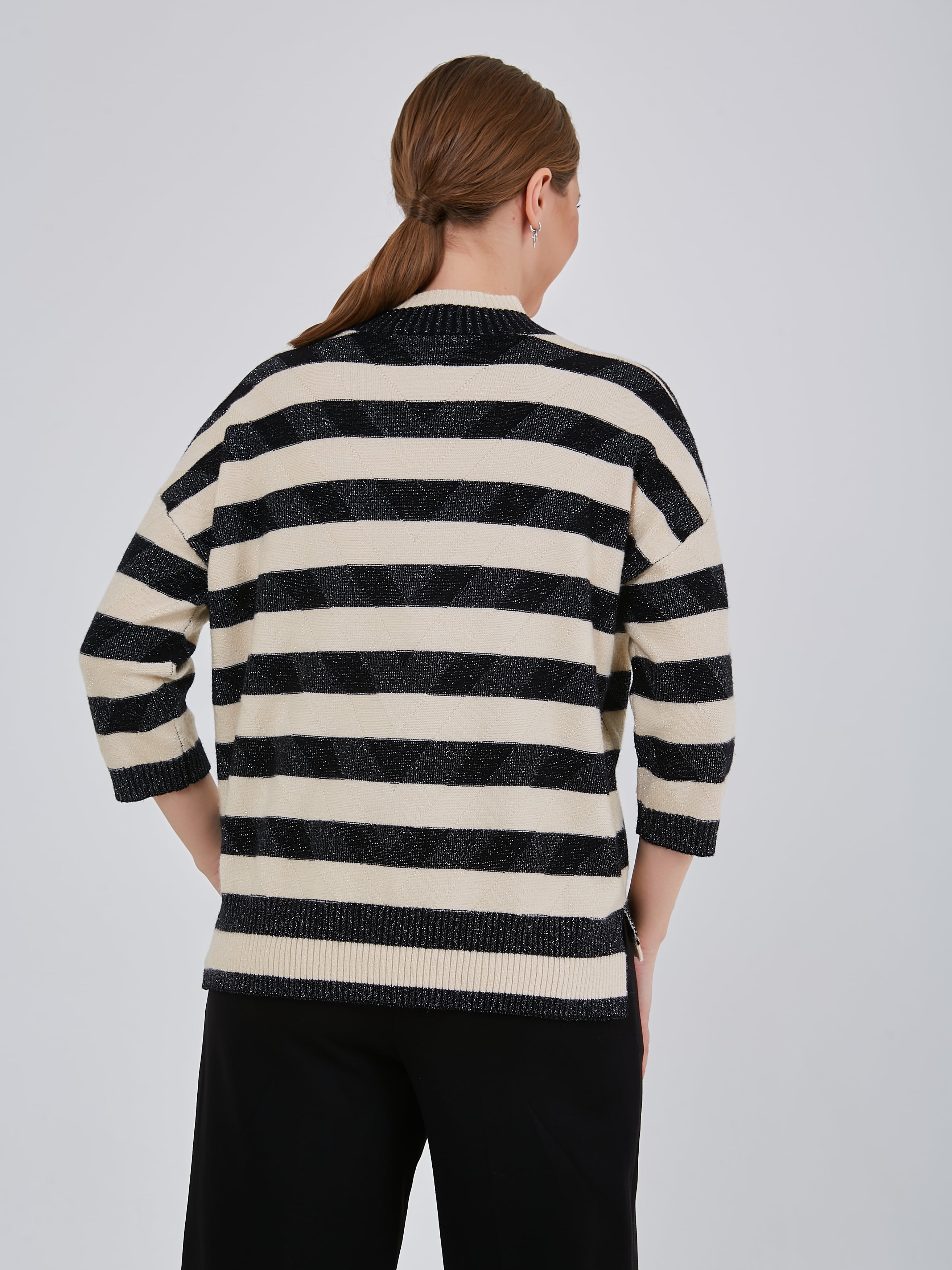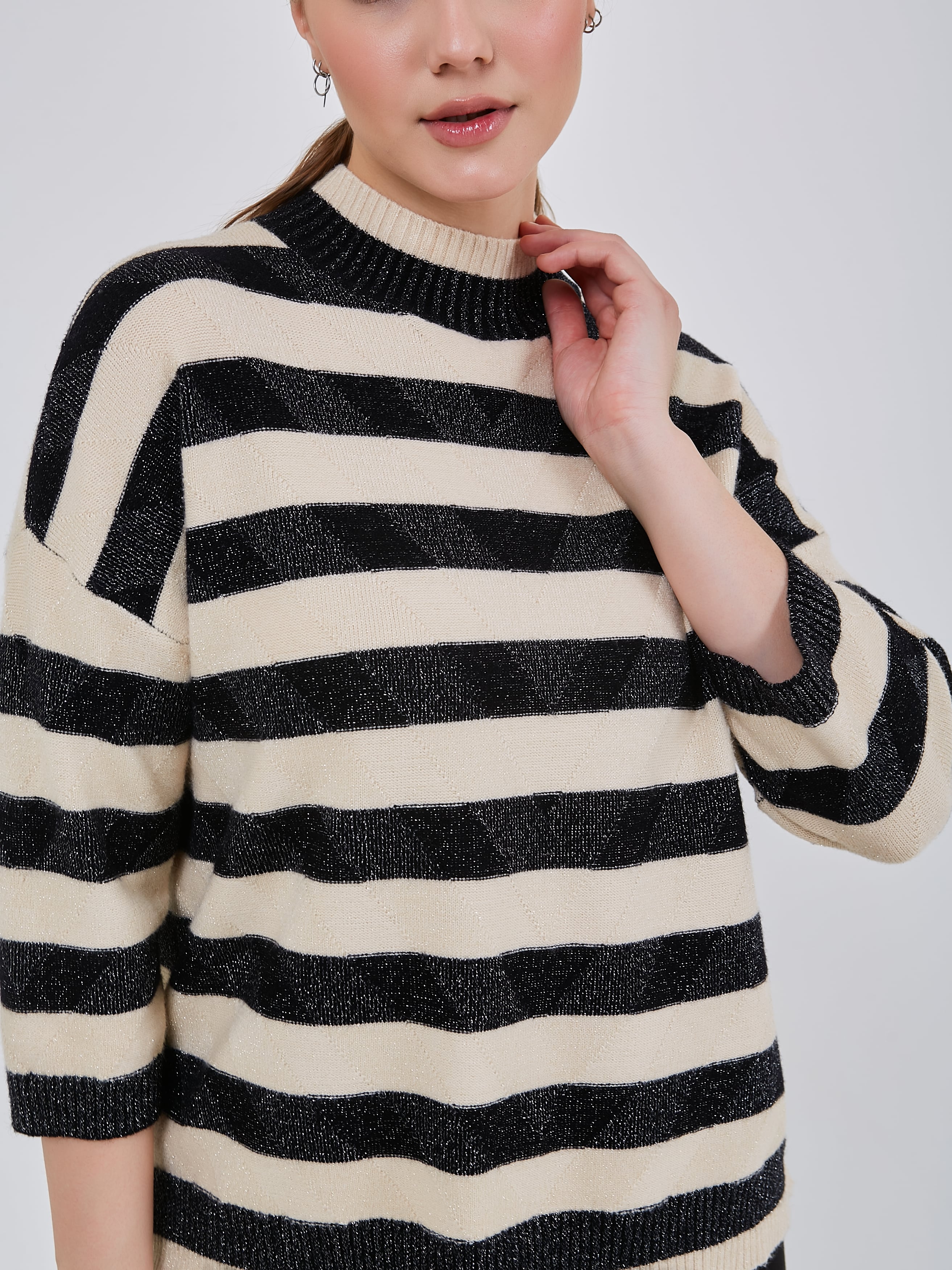Джемпер с принтом в полоску и люрексным декором в виде диагональных полосок, зрительно вытягивающий силуэт. Длина рукава 3/4. Коллекция Осень-Зима 2024 Капсула "Унесённые ветром"
