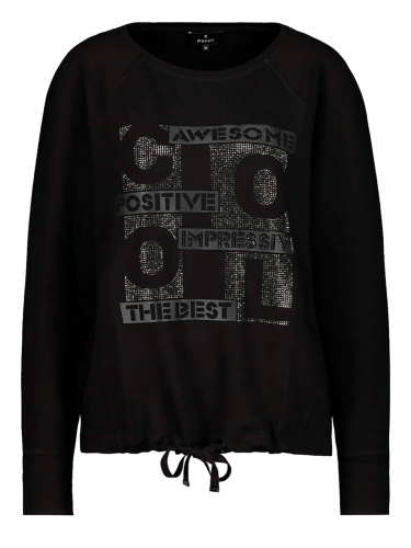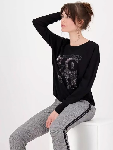 Однотонный пуловер прямого кроя с принтом на груди. Длинные рукава реглан, овальный вырез горловины. Пуловер может выступать как самостоятельный верх или надеваться под жакет или кардиган.