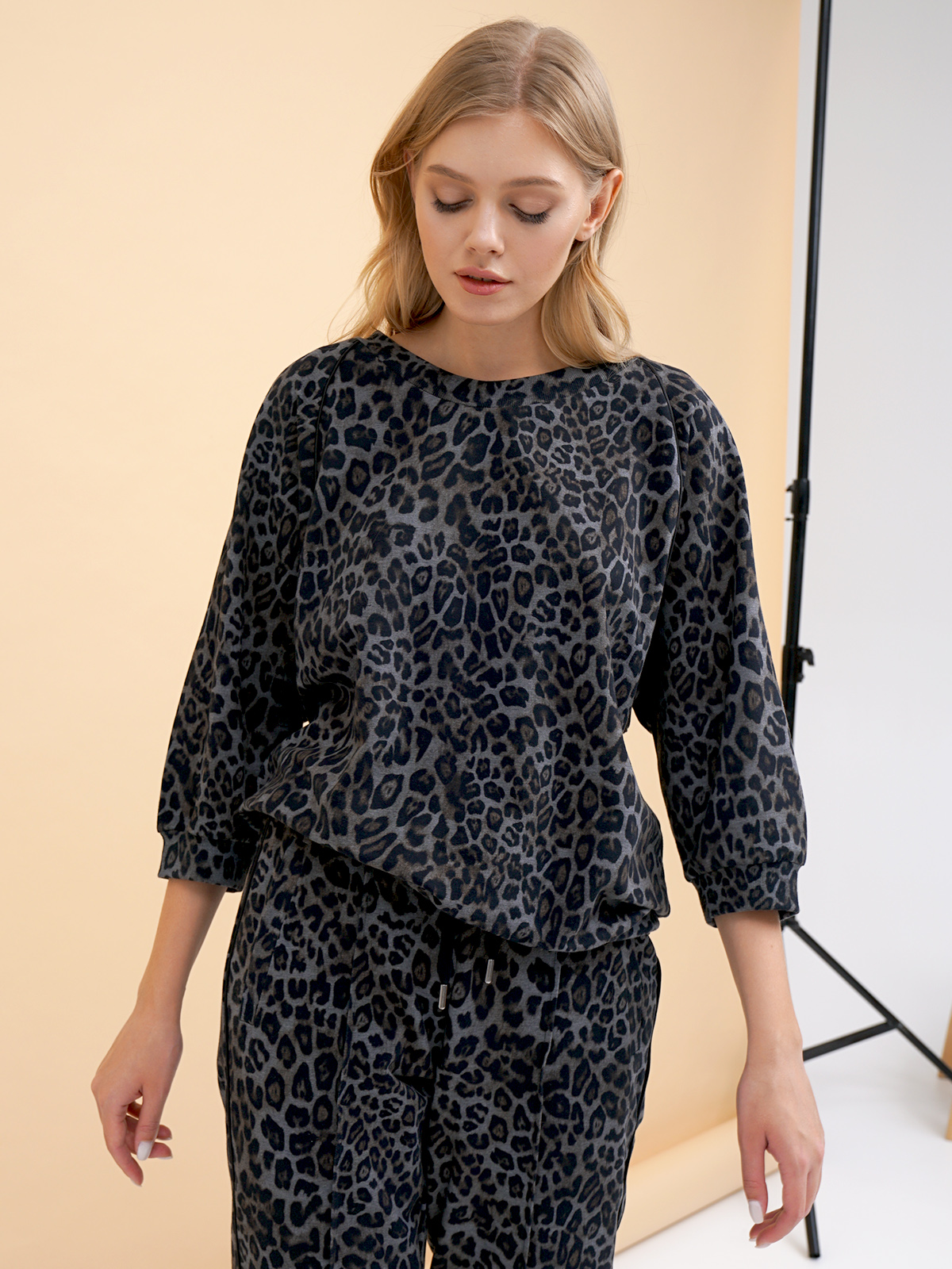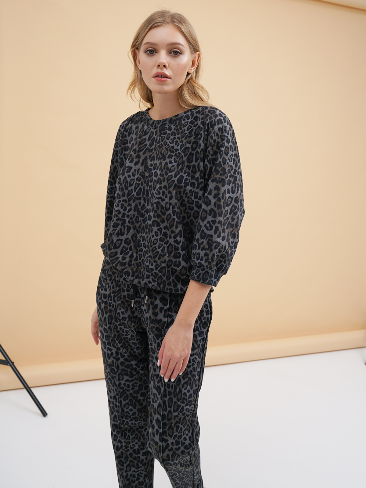 Джемпер с анималистичным узором по всей поверхности изделия. Свободный крой, круглый вырез горловины. Длинные втачные рукава с трикотажными манжетами. Эластичная лента по низу изделия.