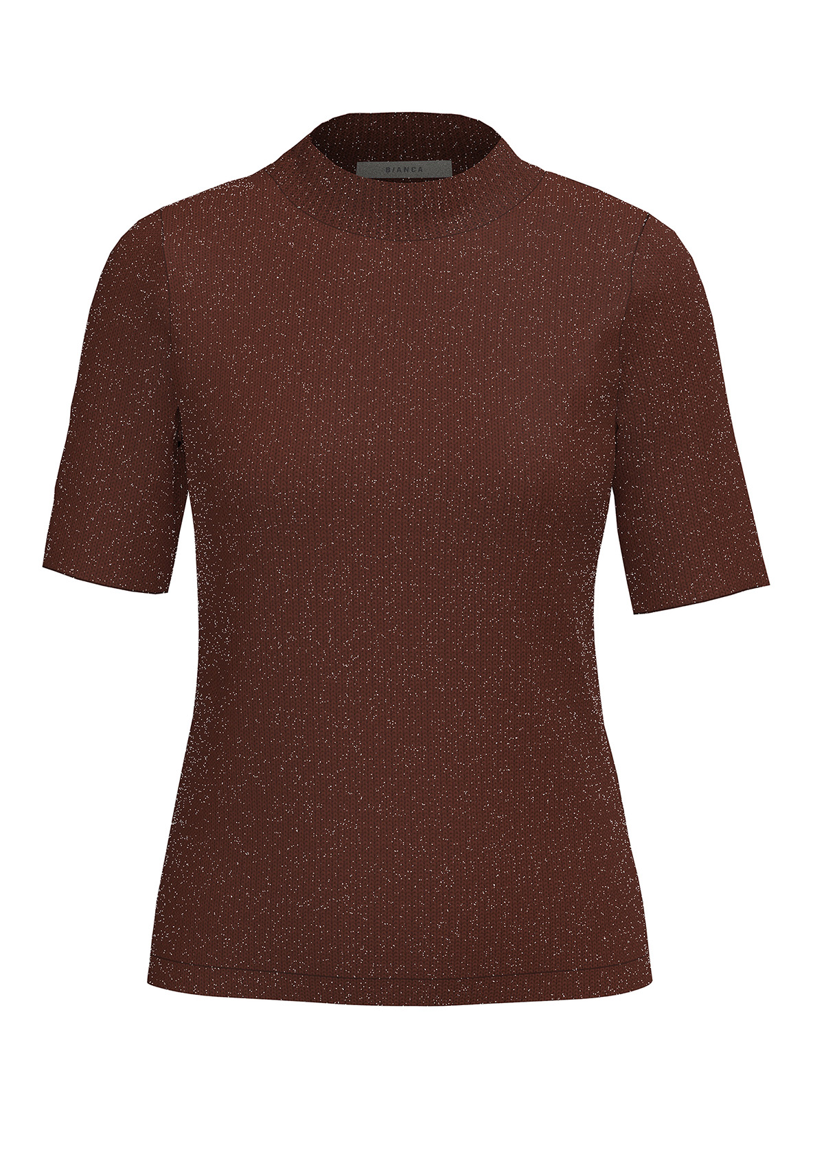 Джемпер прямого покроя с воротником-стойкой и рукавами 1/2 - отличный компаньон для любого образа! Классический цвет кофе поистине универсален и подходит ко всему. Смесовый материал с хлопком комфортен и приятен к телу, а нить люрекса в составе изделия придает легкий блеск.