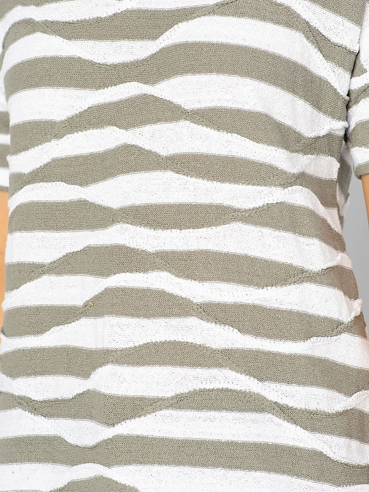 Джемпер с коротким рукавом. Состав ткани из хлопка из синтетических материалов обеспечивает отличную посадку и легкость в уходе. В дизайне интересно обыгран тренд на полоску: создается оптическая иллюзия волн. Нейтральные цвета джемпера делают его универсальным элементом любого гардероба.