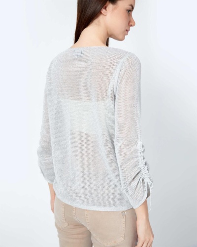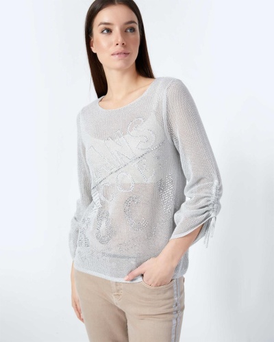 Ажурный джемпер. Нить люрекса придает материалу легкий блеск. Декор стразами. Рукава 3/4 на кулиске. Круглый вырез горловины.