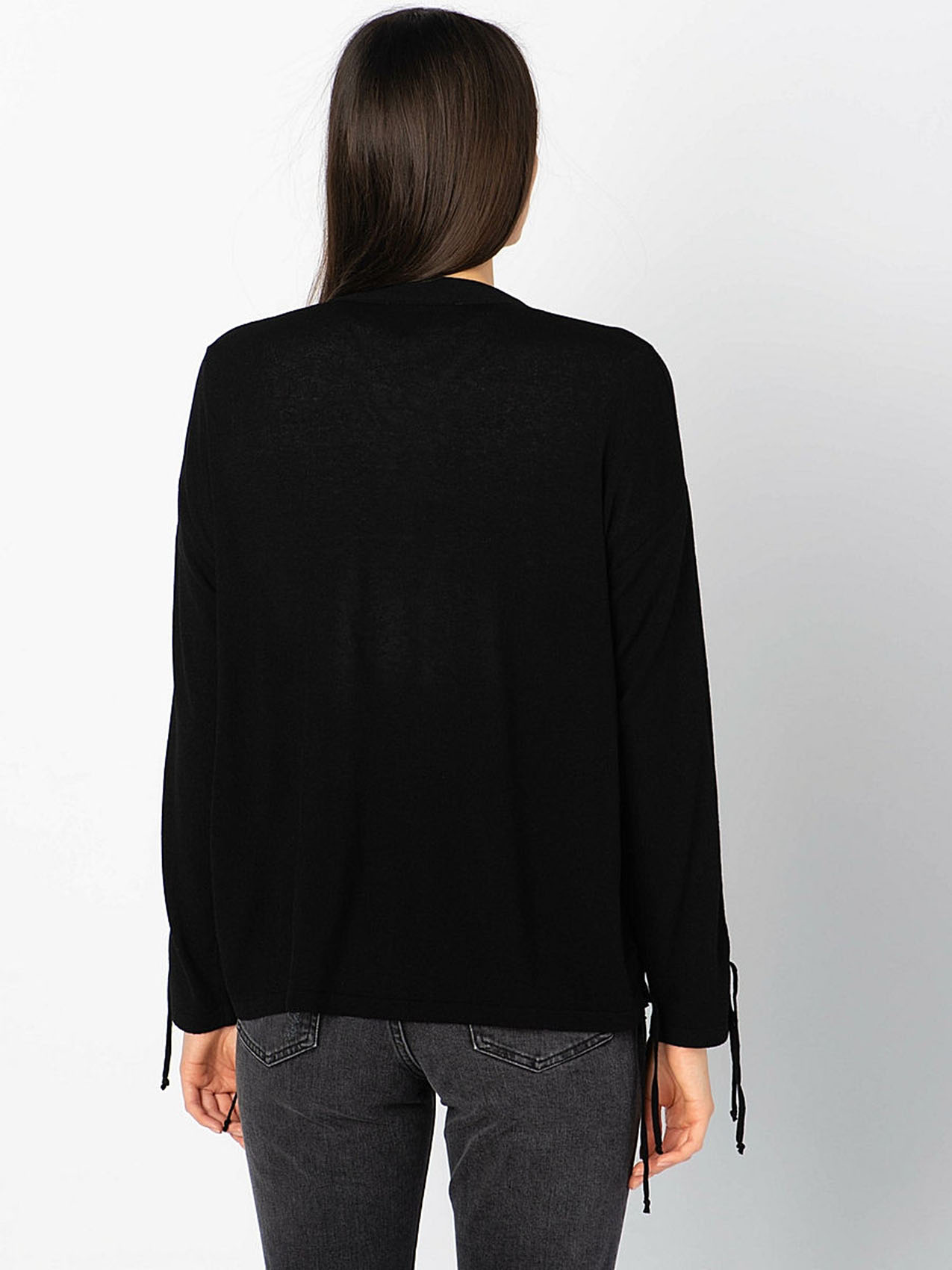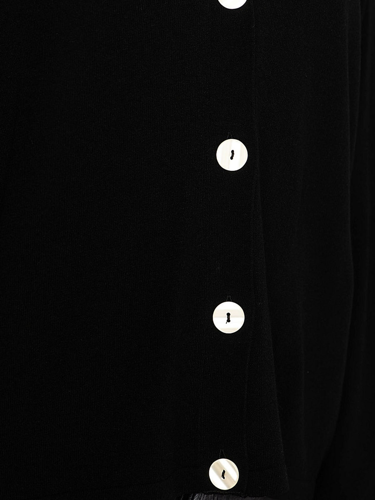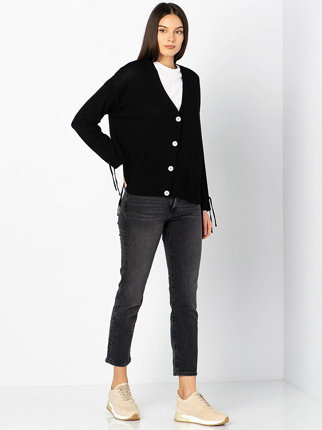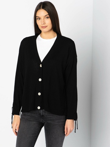 Трикотажный кардиган с контрастными пуговицами. V-образный вырез, длинные рукава.
