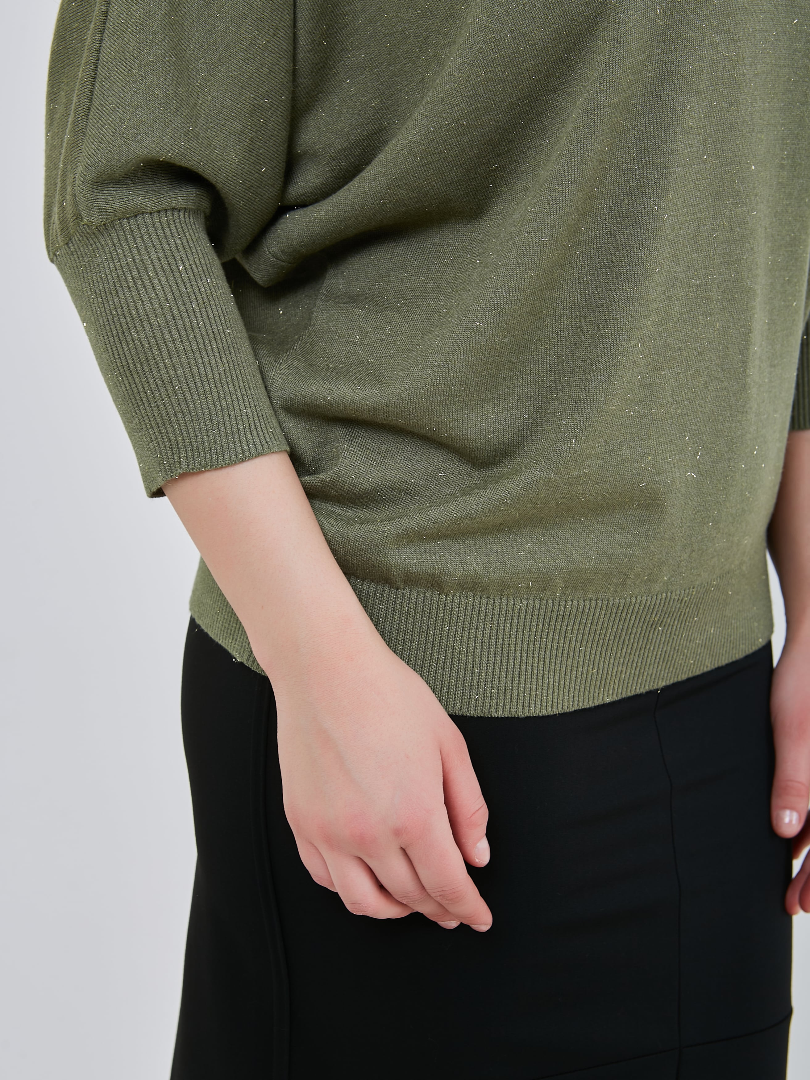 Джемпер насыщенного и мягкого оттенка "шалфей" с люрексным блеском и сглаженным треугольным вырезом горловины. Рукав - летучая мышь длиной 3/4. Осень-Зима'25/26. Капсула "Малахитовая шкатулка"