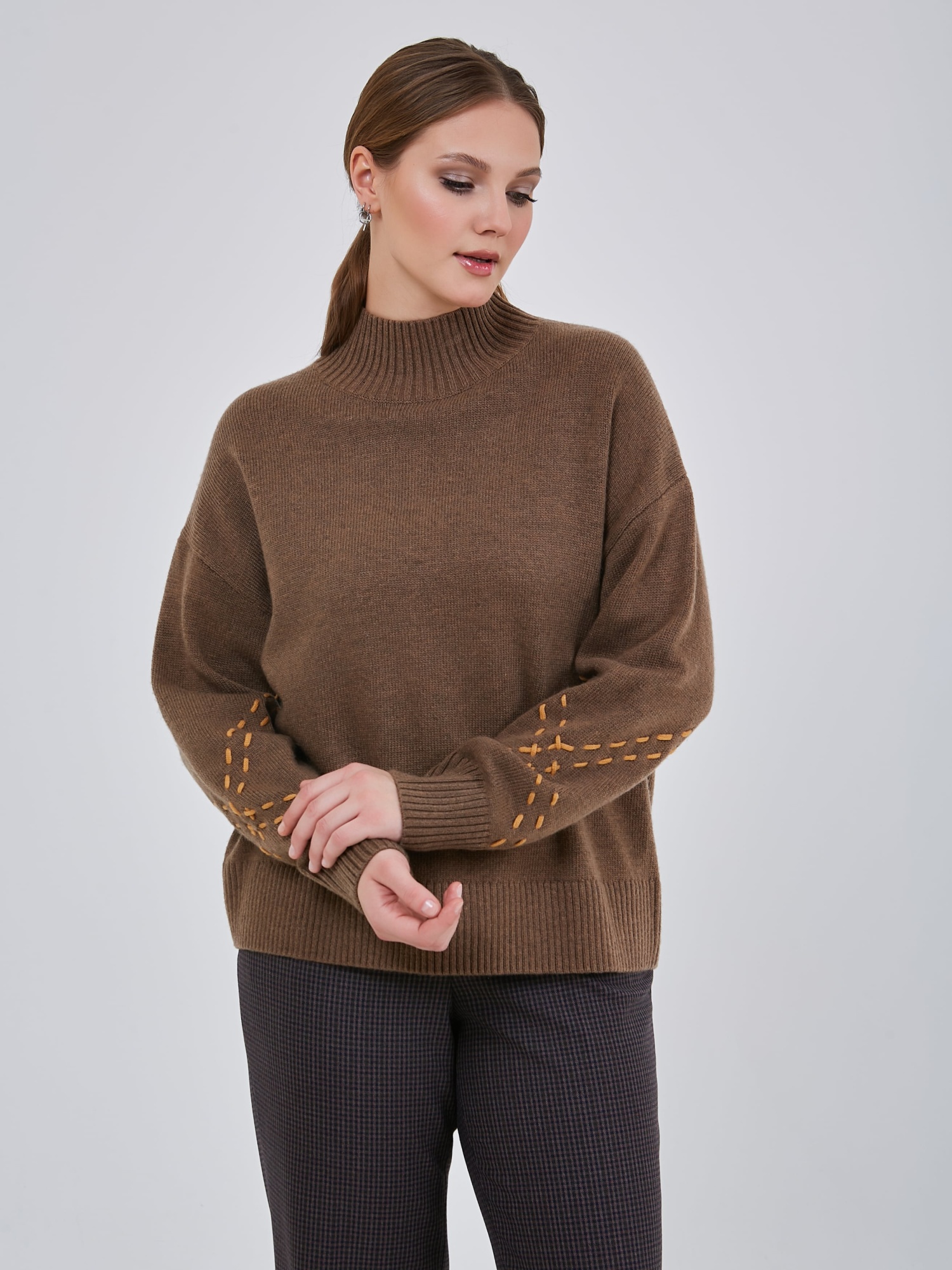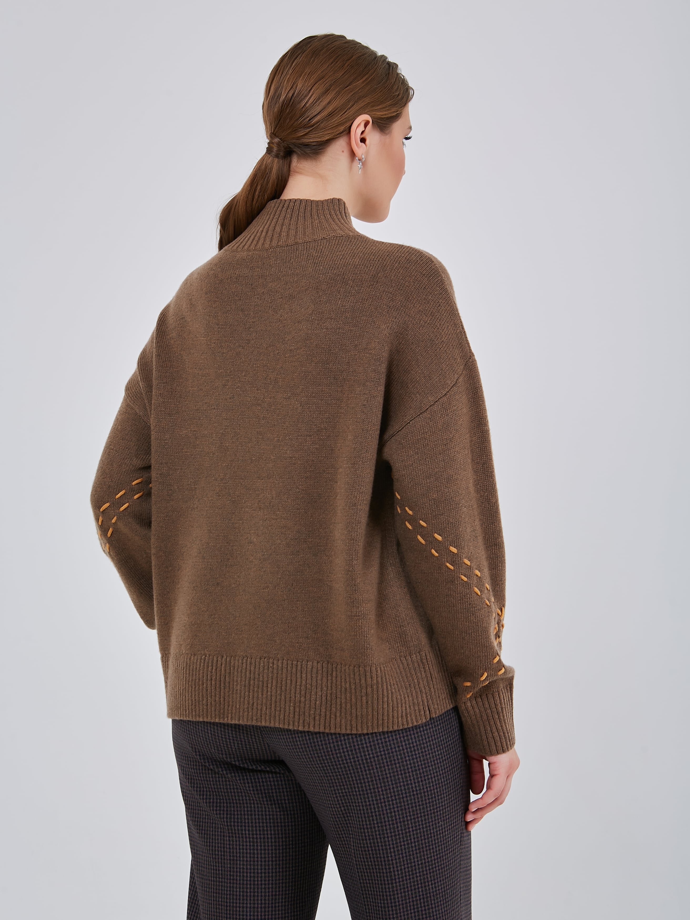 Джемпер шоколадного оттенка со спущенной линией плеча, с широкими эластичными манжетами, воротником и резинкой по низу изделия. Рукава украшены контрастными нитями в виде ручного шва. Осень-Зима'25/26. Капсула "Хозяйка медной горы"