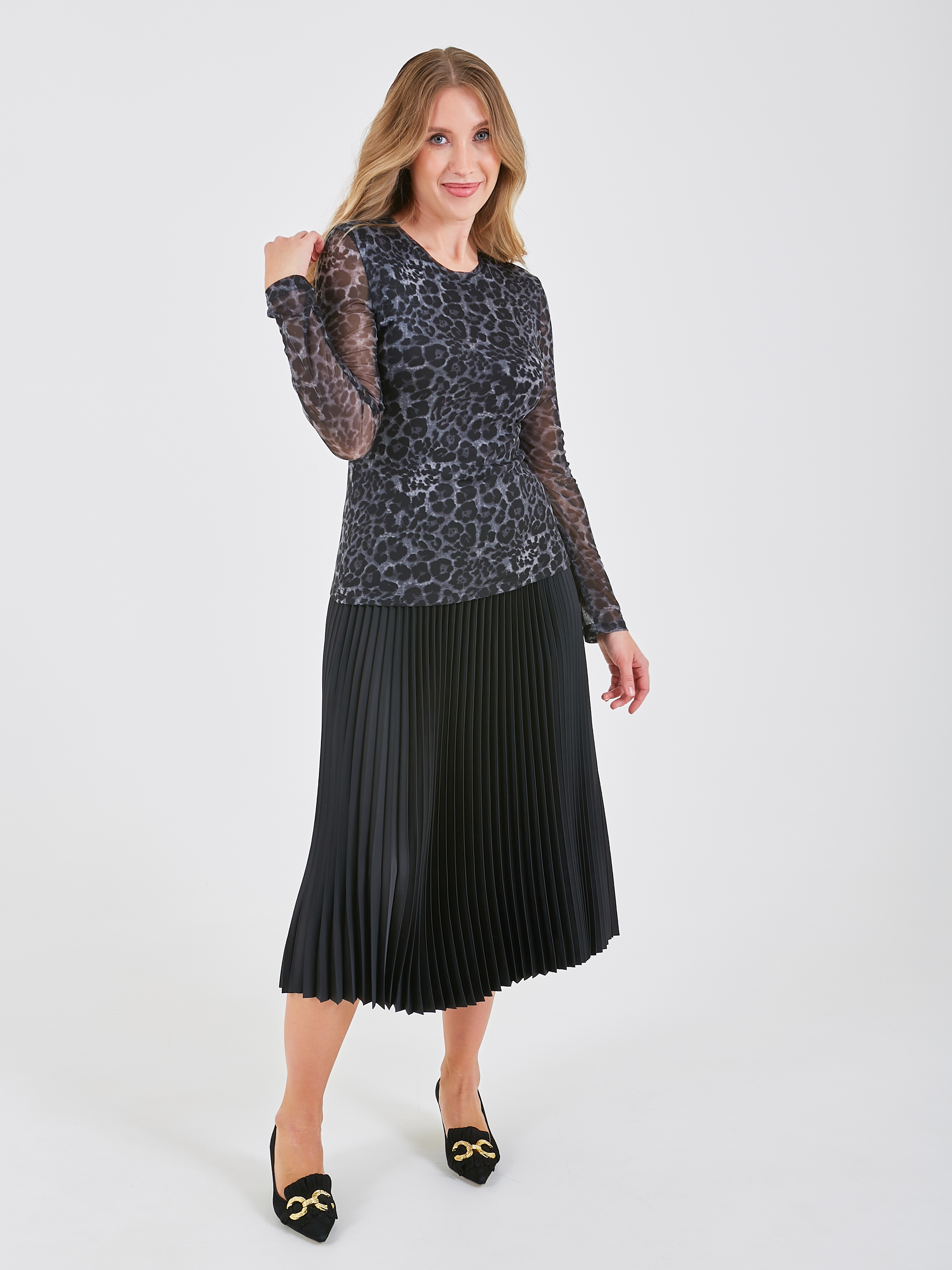 Приталенная блузка с леопардовым принтом. Полупрозрачная фактура на рукавах придаёт лёгкость и изящество. Коллекция Осень-Зима 2024-2025. Капсула "Гостья из будущего".