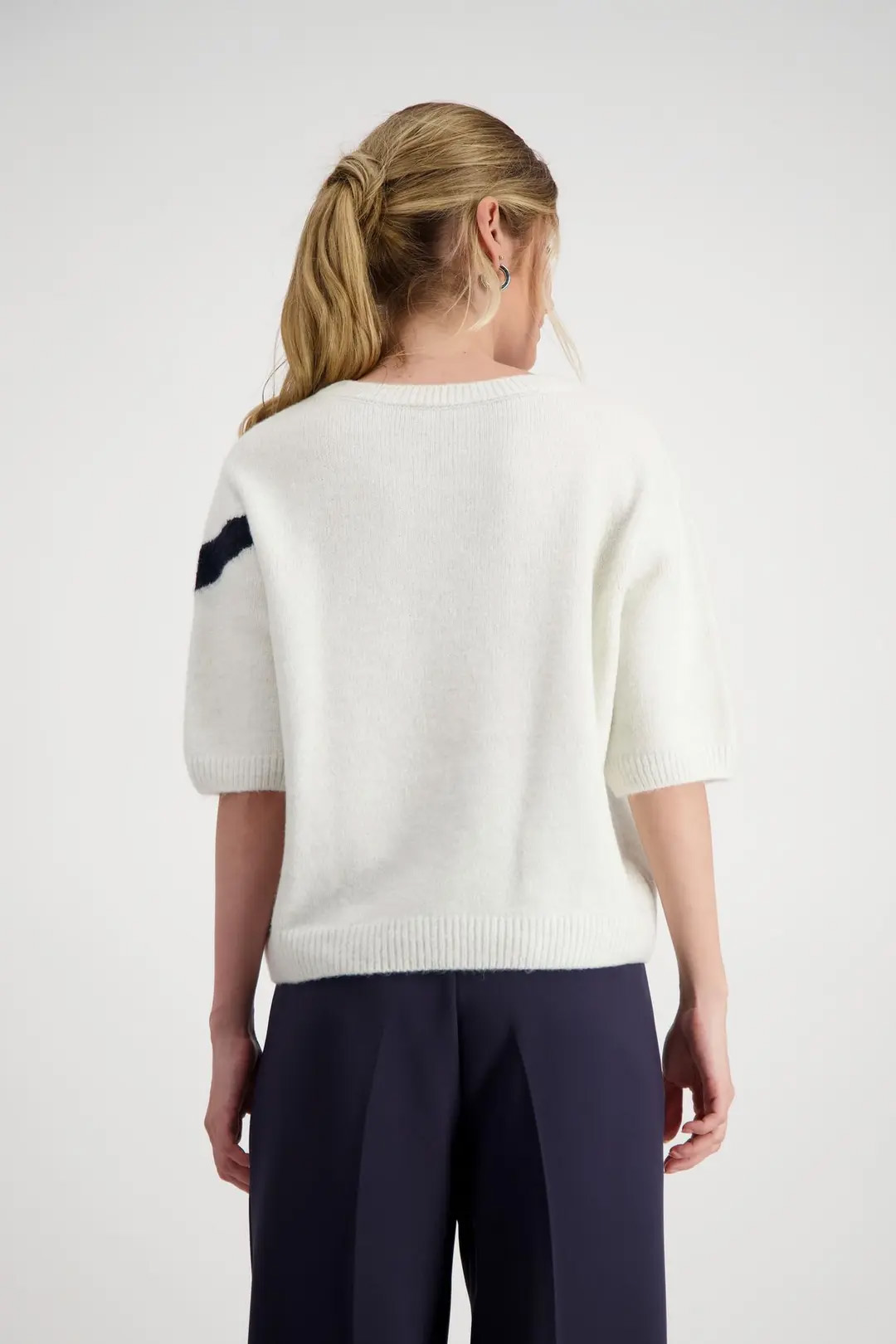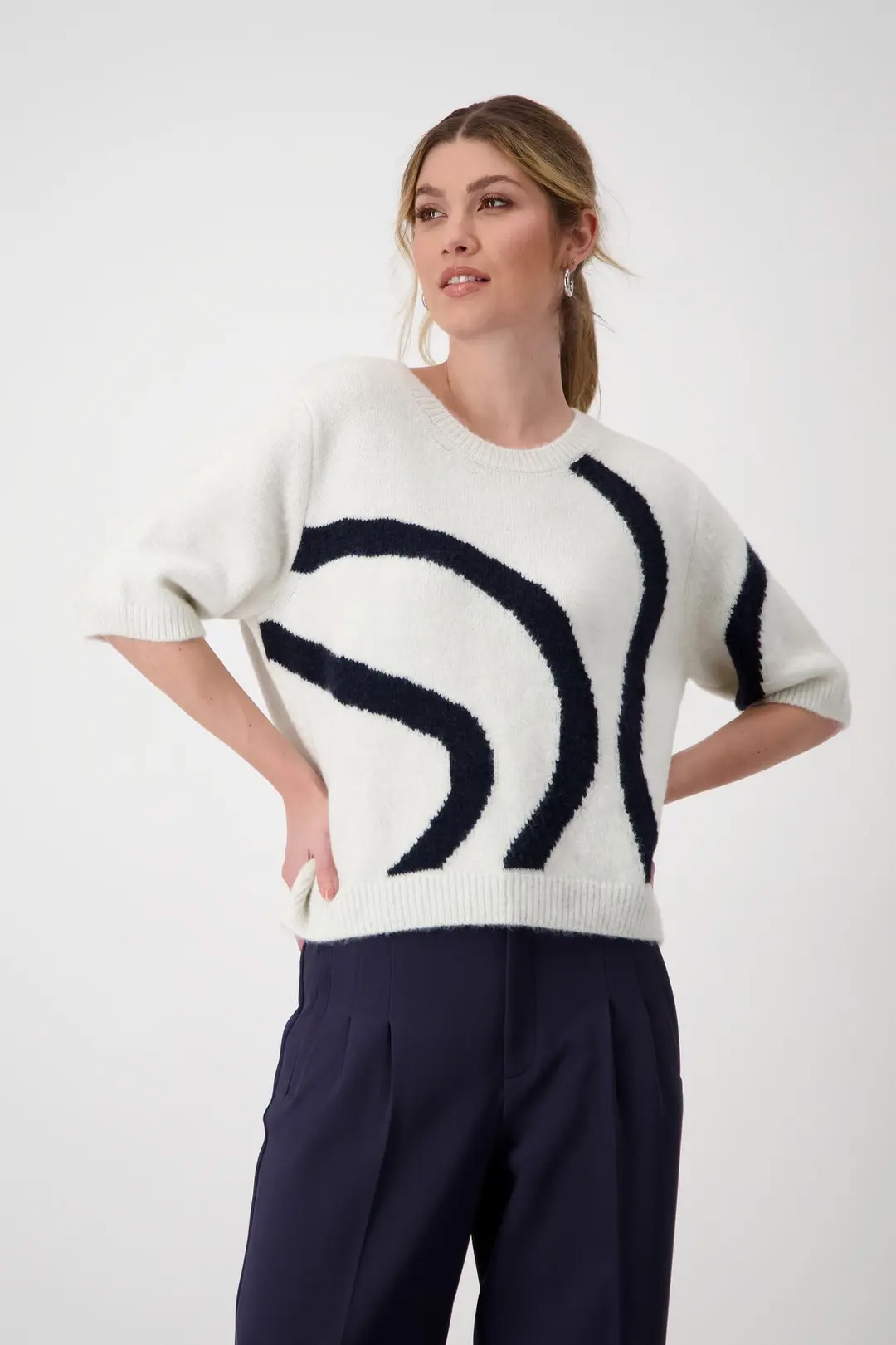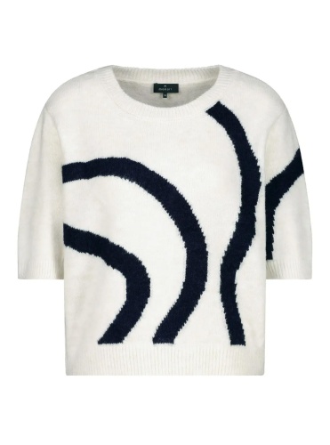 Свитер MONARI вязки интарсия из смесовой вискозы с круглым вырезом в рубчик и короткими рукавами.