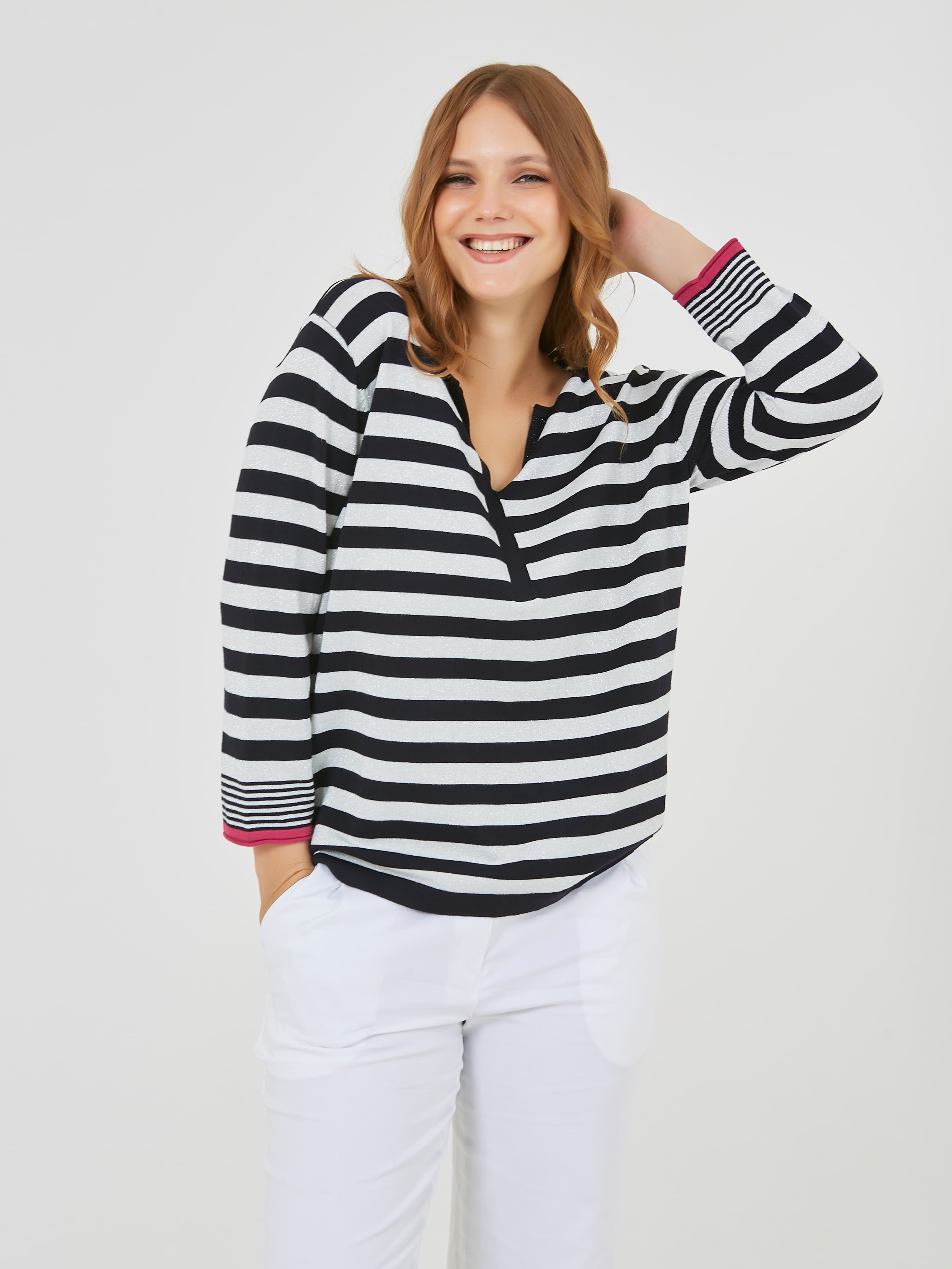 Джемпер в полоску с ярким кантом по рукаву. Весна-Лето 2025. Капсула "Самарканд". Параметры модели: 95-64-101, рост 175, размер 44-46