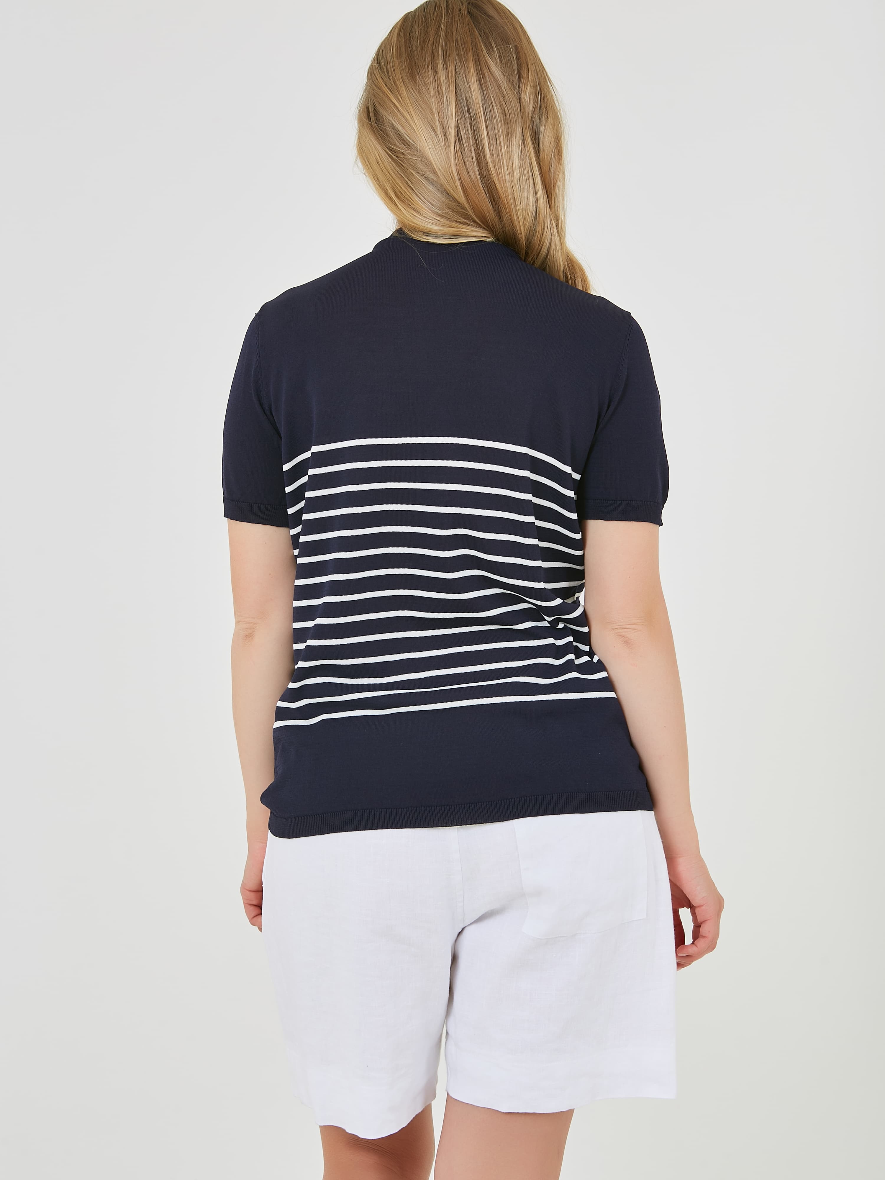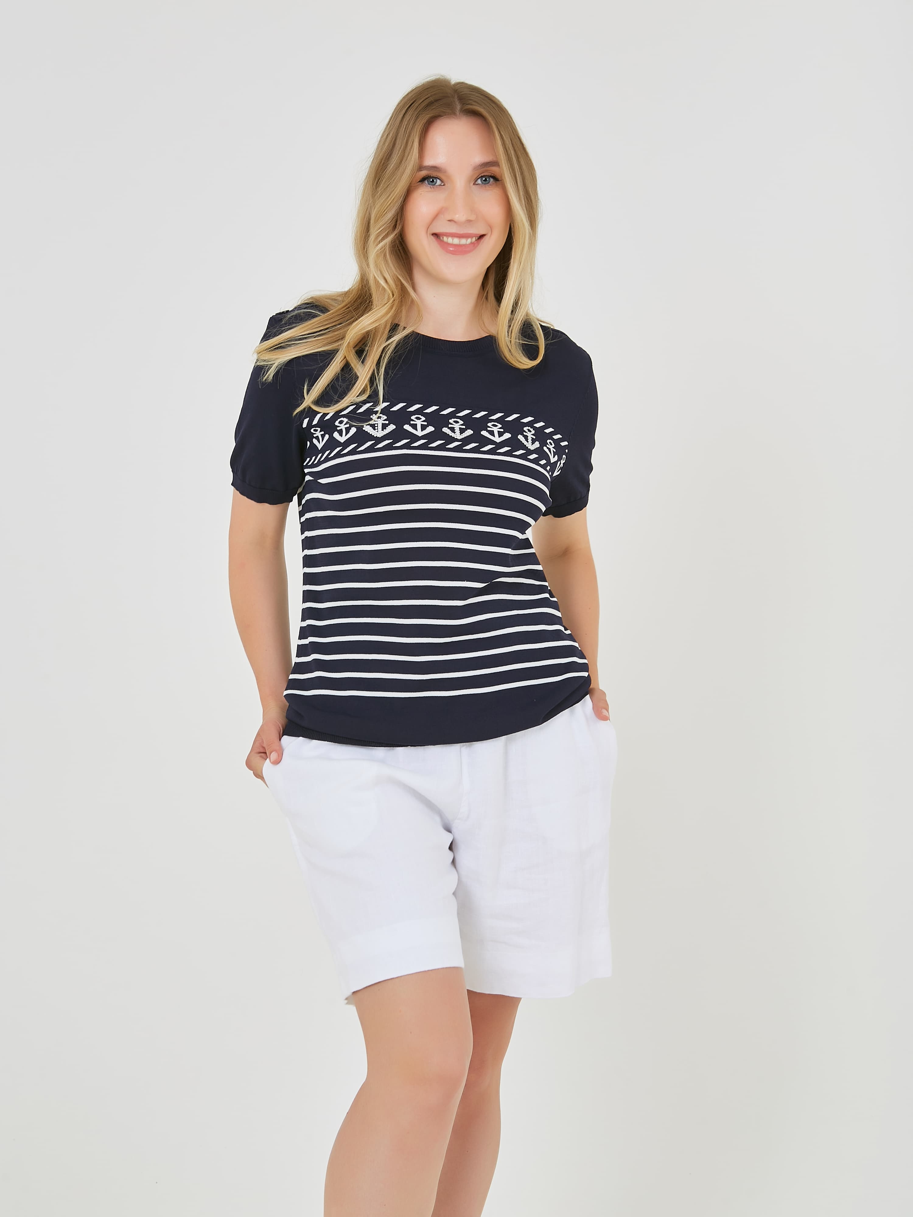 Джемпер выполнен в темно-синем цвете и украшен горизонтальными полосками и узором с якорями. Короткие рукава и комфортный крой, делает его подходящим для теплой погоды и повседневного ношения. Коллекция Весна-Лето 2025. Капсула "Самарканд". Параметры модели: 89-70-92, рост 167, размер 44-46