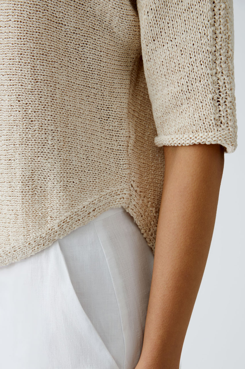 Джемпер выполнен в светлом бежевом оттенке, который придает изделию мягкость и естественность. Модель имеет свободный, немного укороченный крой с рукавами длиной до локтя. Ткань связана крупной вязкой с текстурным узором по центру переда, добавляющим интересную деталь. Джемпер отличается округлым вырезом горловины и аккуратной отделкой краев, что делает его универсальным и стильным элементом гардероба.