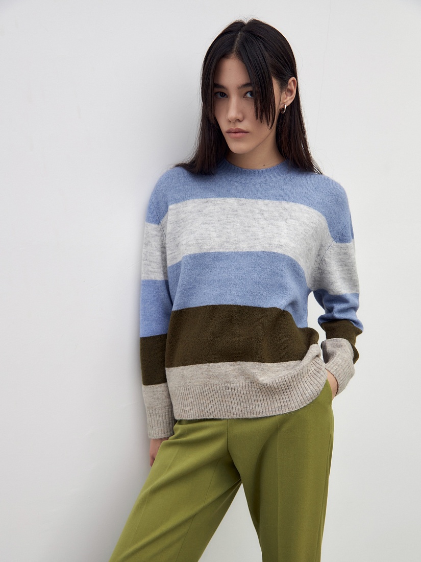 Уютный базовый свитер в полоску, круглый вырез горловины, рукав полной длины. Благодаря смесовомой композиции пряжи и содержанию овечьей шерсти свитер имеет мягкую дышащую поверхность, которая приятна при соприкосновении с кожей.