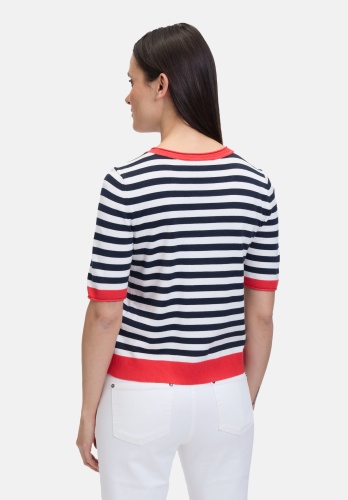 Этот базовый свитер в модном стиле колор-блок вдохнёт новую жизнь в ваш гардероб. Прямой крой и эффектные полоски создают современный спортивный образ. Круглый вырез и короткие рукава идеально подходят для создания непринуждённых летних образов.