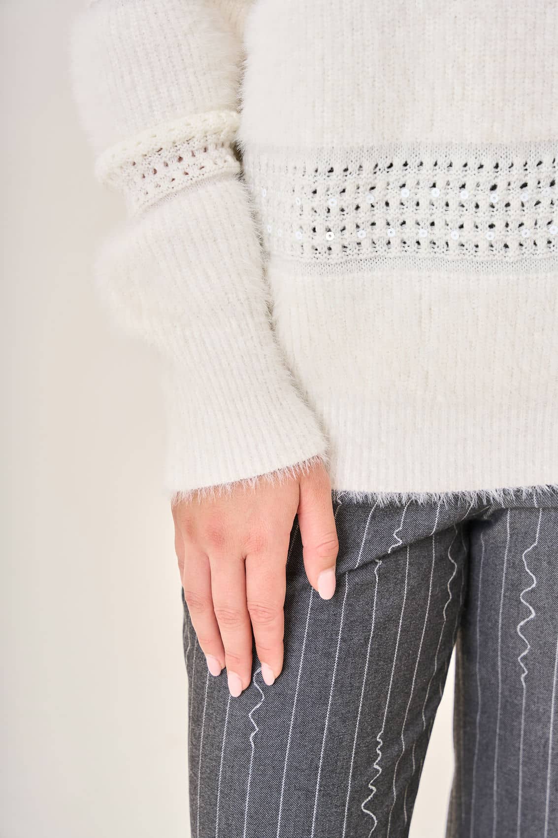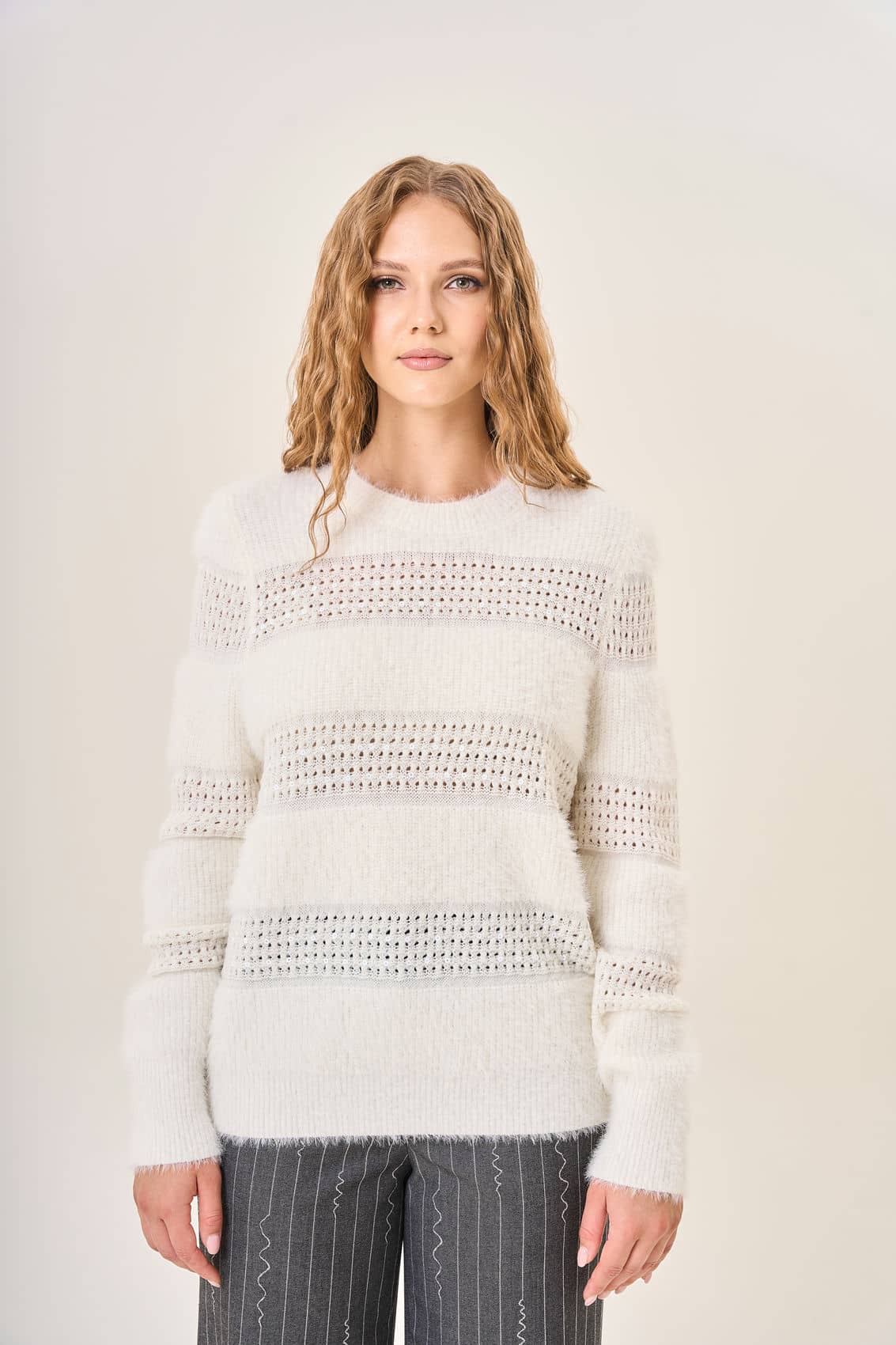 Женский молочный пушистый джемпер элегантно сочетает различные фактуры и техники вязки создавая стильный объемный рисунок. Идеально подчеркивает все преимущества фигуры корректируя недостатки благодаря мягкому облегающему крою. Рельефные полосы визуально добавляют объема и создают ощущение многослойности. Мягкий материал приятен к телу, обеспечивает тепло и уют в прохладное время года. Осень-Зима'25/26. Капсула "Вишневый сад"