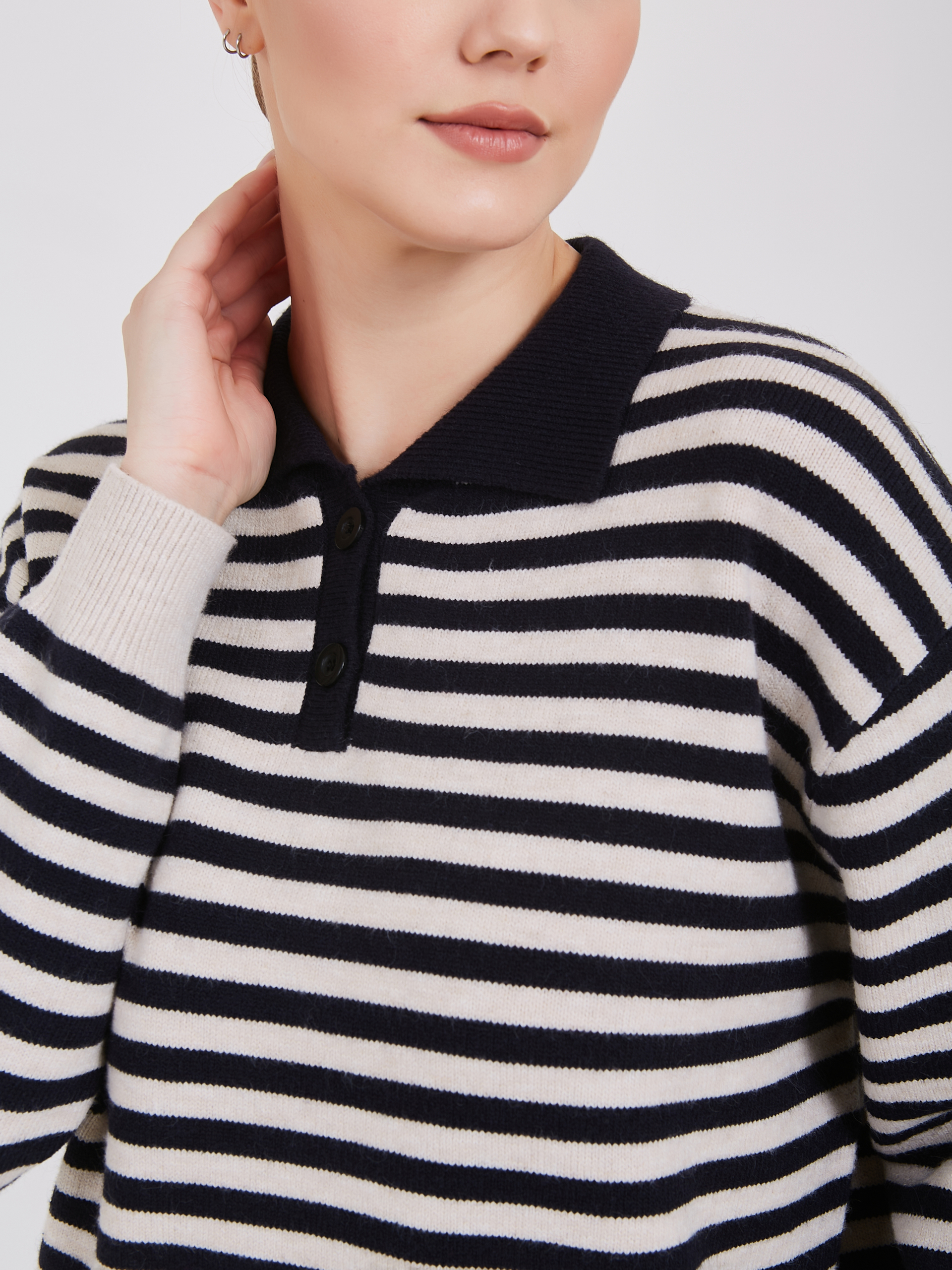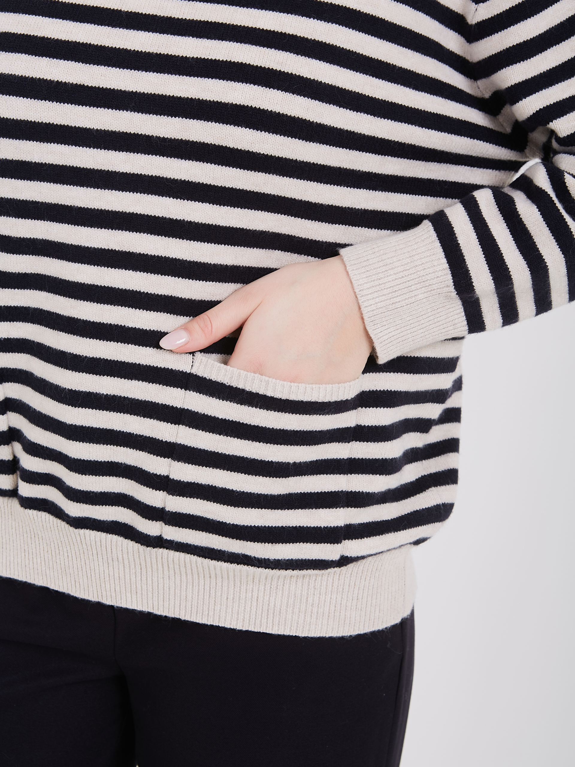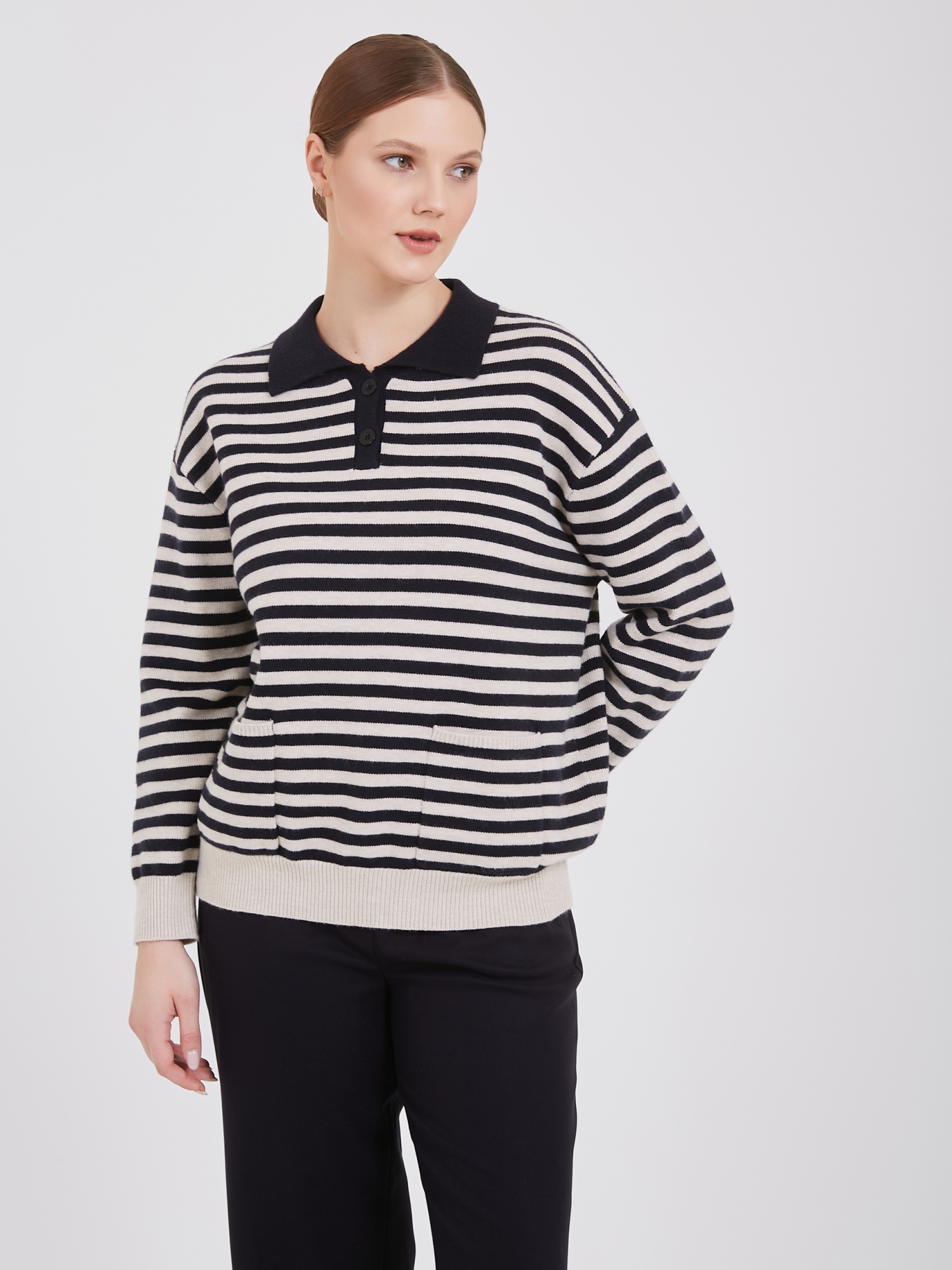 Полосатый свитер классического стиля. Темно-синие и белые горизонтальные полосы задают ритм, создавая динамичный образ. Воротник-поло и два передних кармана добавляют нотку спортивного шика. Бежевые манжеты и нижний край завершают композицию, привнося тепло и уют. Материал высокого качества обеспечивает комфорт. Осень-Зима'25/26. Капсула "Алые Паруса"
