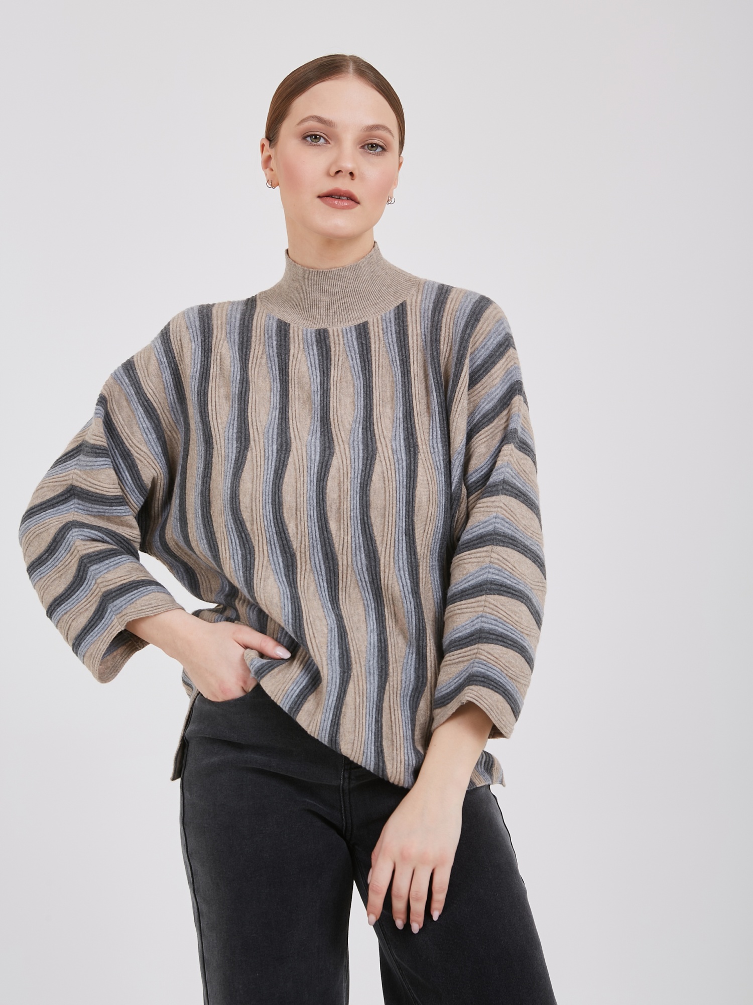 Женский свитер свободного кроя с высоким воротником, украшенный вертикальной полоской трех разных оттенков: бежевого, серого и светло-голубого. Рукава длиной три четверти добавляют особый шарм и современность облику. Осень-Зима'25/26. Капсула "Вишневый сад"
