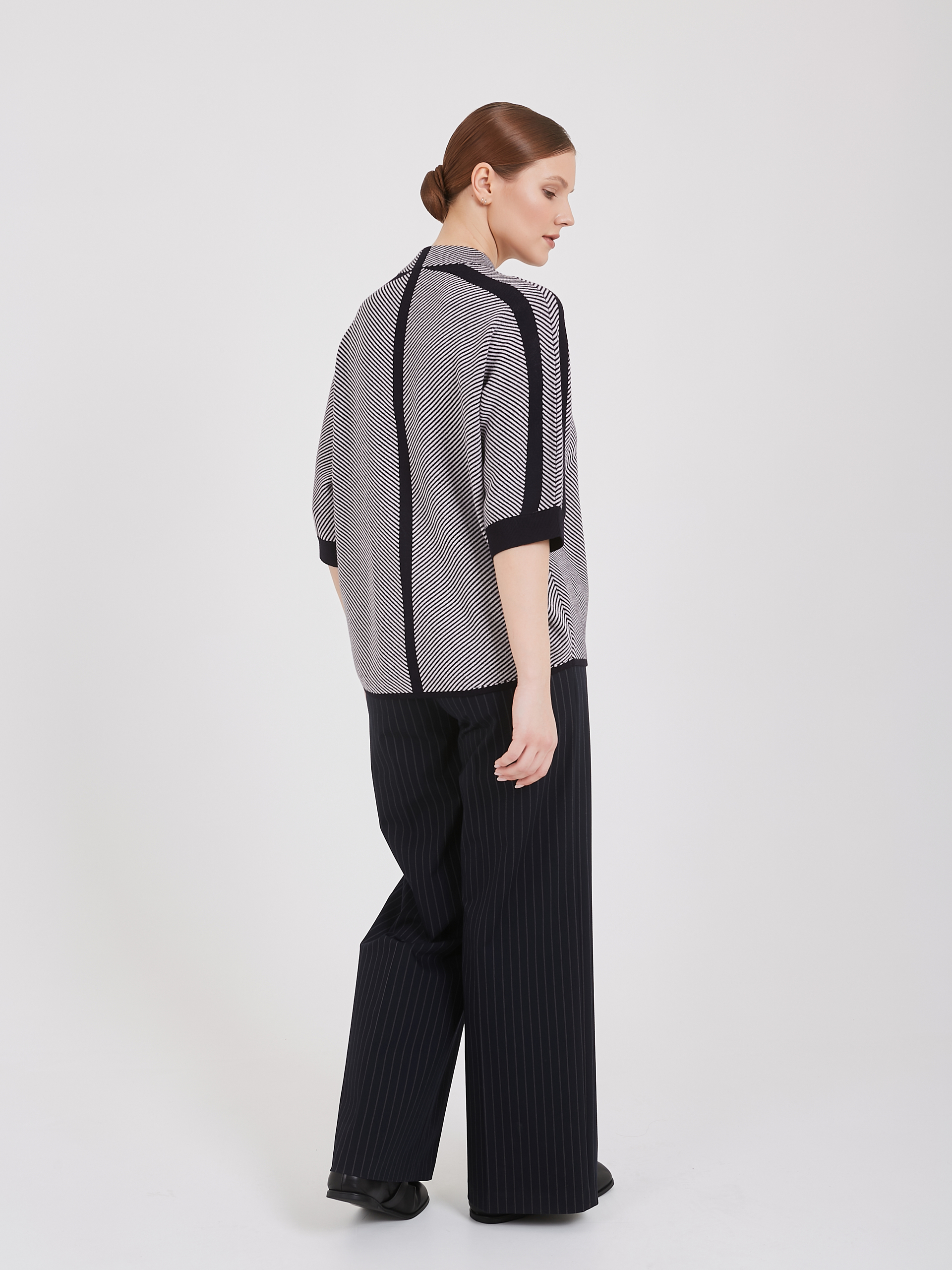 Женский джемпер с динамичным дизайном: диагональные полосы белого и тёмно-синего оттенков начинаются от правого плеча и плавно спускаются к левому краю. Центральная линия и плечи украшены контрастной тёмно-синей отделкой, усиливающей визуальное восприятие. Небольшой накладной карман слева добавляет функциональности и поддерживает общую стилистику полосатой композиции.Осень-Зима'25/26. Капсула "Лиловый шар"