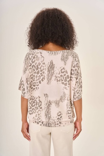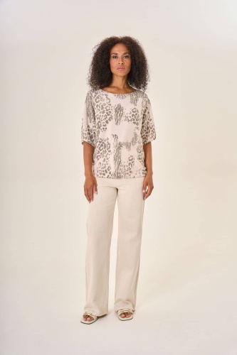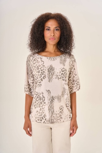 Светлая блузка с леопардовым принтом в серых оттенках. Элегантный фасон и свободный крой добавляют образу утонченности. Леопардовое графичное оформление в спокойных серых тонах придает индивидуальность и изысканность. Ткань высокого качества обеспечивает максимальный комфорт и удобство в течение всего дня. Прекрасно дополняет гардероб, создавая стильный и современный образ.