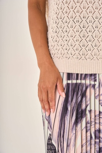 Бежевая вязаная кофта с короткими рукавами. Рельефный узор в виде ромбов добавляет изделию выразительности и уникальности. Мягкий натуральный материал обеспечивает комфорт. Универсальная модель прекрасно дополнит любой наряд, придавая ему уютный и гармоничный вид.