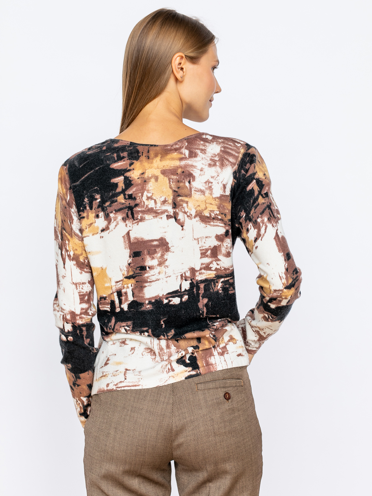 Джемпер с ярким абстрактным принтом выполнен в трех оттенках: бордовом, синем и коричневом. Широкий овальный вырез горловины подчеркивает изящество линии шеи. Полуприлегающий силуэт подчеркивает женственность форм. Джемпер сочетаетается с юбкой и брюками и расставляет яркие акценты в вашем аутфите.