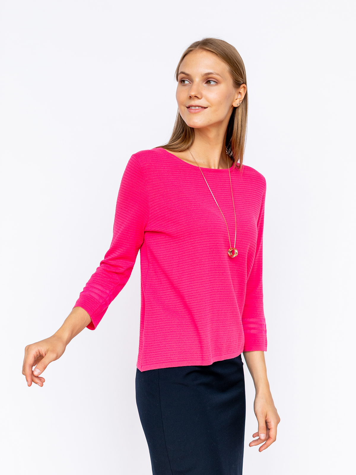 На сайте указаны российские размеры. Ткань: смесовая эластичная ткань. В составе:15% полиамид, 60% вискоза, 25% полиэфир. Крой: джемпер прямого силуэта с рукавом ¾ и круглым вырезом. Эластичность материала позволяет изделию садиться на разные типы фигур, а достаточная плотность – не подчеркивать недостатки фигуры. Отделка: яркий цвет в сочетании с объемной фактурой – именно так в Stern представляют стиль современной женщины, живущей полной жизнью. В ассортименте Stern вы найдете сотни вариантов для создания ярких образов с этим джемпером. Загляните в разделы брюк, юбок и джинсов.