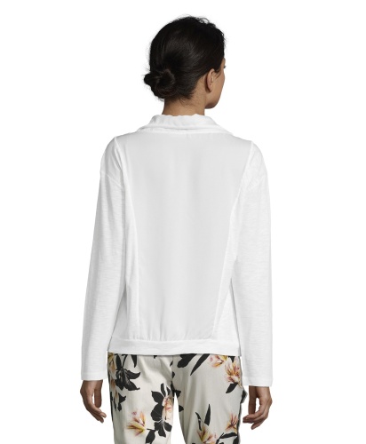 Джемпер прямого покроя. Длинные рукава, капюшон на кулиске. Сочетание приятных к телу материалов. Отличный вариант для прогулок и занятий спортом.