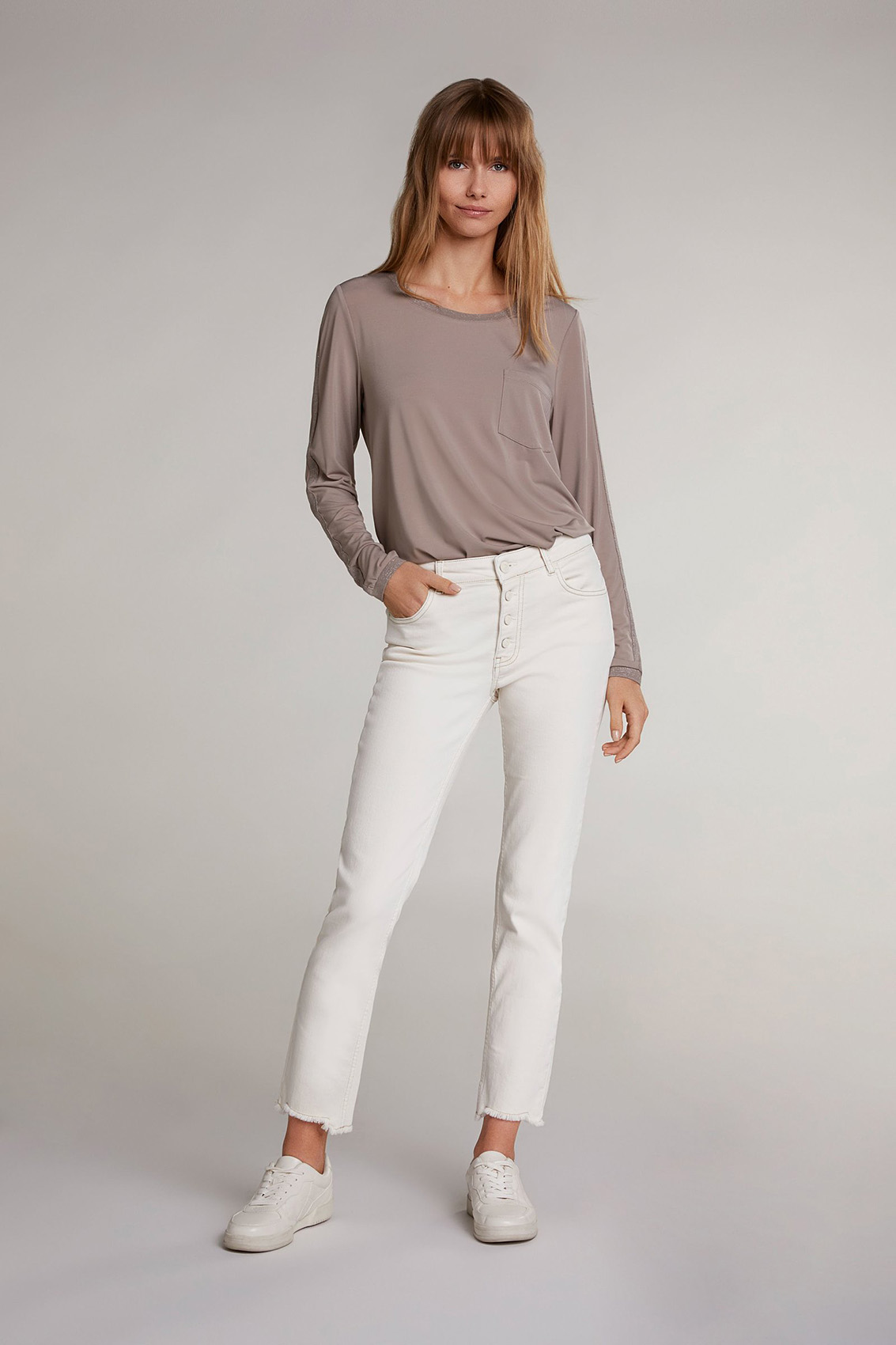 Футболка-лонгслив совершенно необходима в любом гардеробе. Прямой покрой, круглый вырез горловины, втачные рукава полной длины, карман на груди, кулиска по низу изделия. Декоративная отделка с нитью люрекса на горловине и рукавах придает образу элегантный блеск.