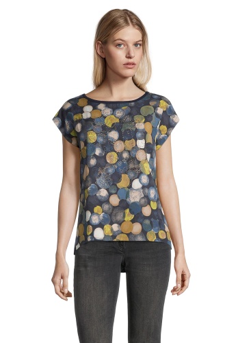 Футболка свободного покроя. Вырез горловины "лодочка", короткие цельнокроеные рукава. Приятный к телу материал из вискозной смеси. Принт в горошек по переду изделия, декор стразами придает легкий блеск. Спинка изделия выполнена из однотонного материала.