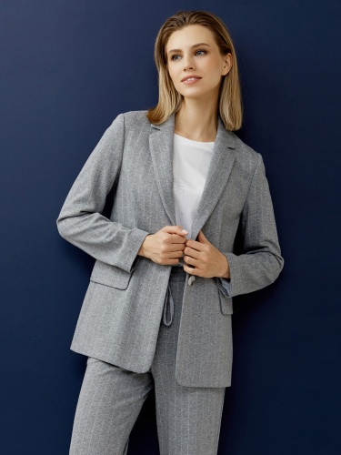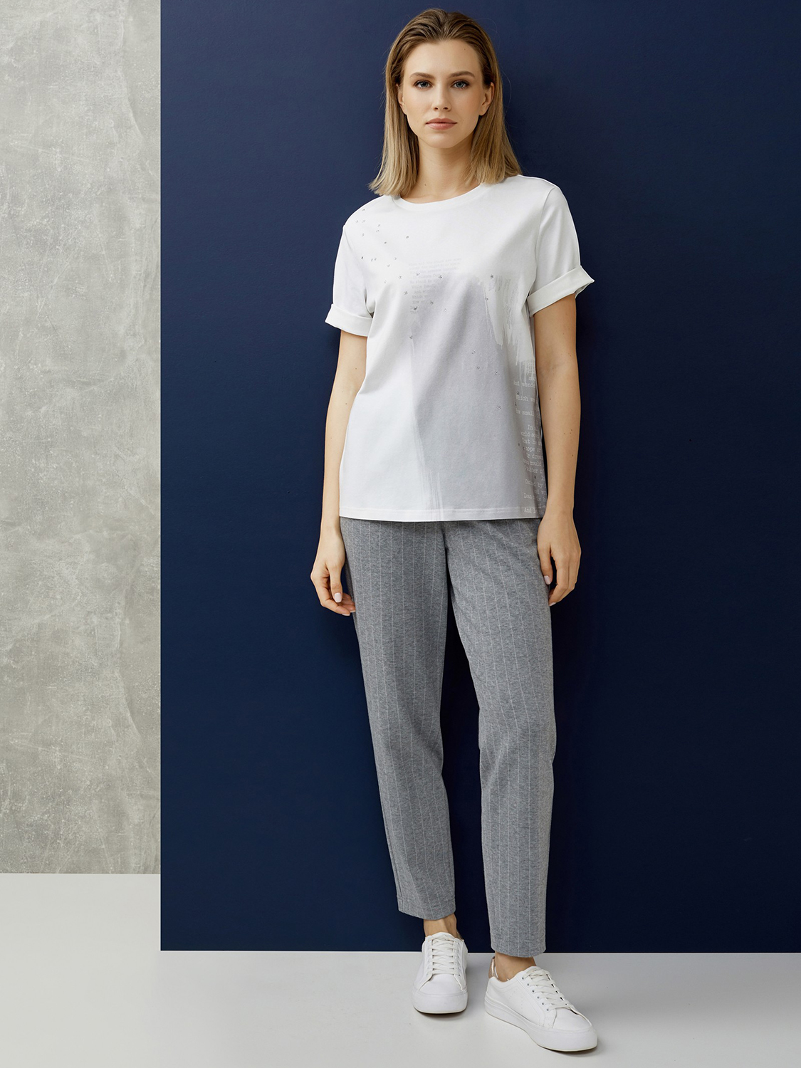 Футболка прямого кроя с абстрактным принтом. Овальный вырез горловины, короткие втачные рукава с отворотом. Футболка – базовый вариант верха, можно носить навыпуск или заправлять в брюки, юбку, использовать как самостоятельный верх или надевать под жакет.
