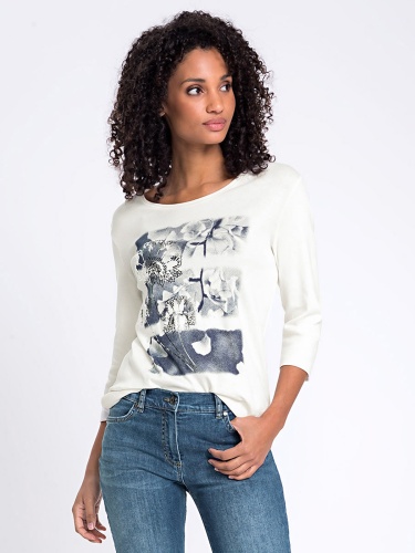 Белая футболка с романтичным принтом. Широкий овальный вырез горловины, прямой силуэт. Втачной рукав ¾. Футболка хорошо сочетается как с брюками или джинсами, так и с юбкой.