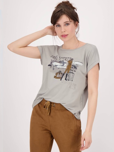 Однотонная футболка прямого кроя с оригинальным принтом на груди. Цельнокроеный короткий рукав, овальный вырез горловины. Футболка – универсальный элемент гардероба, можно носить как заправленной, так и на выпуск, сочетать с жакетом или кардиганом, а также использовать как самостоятельный верх.