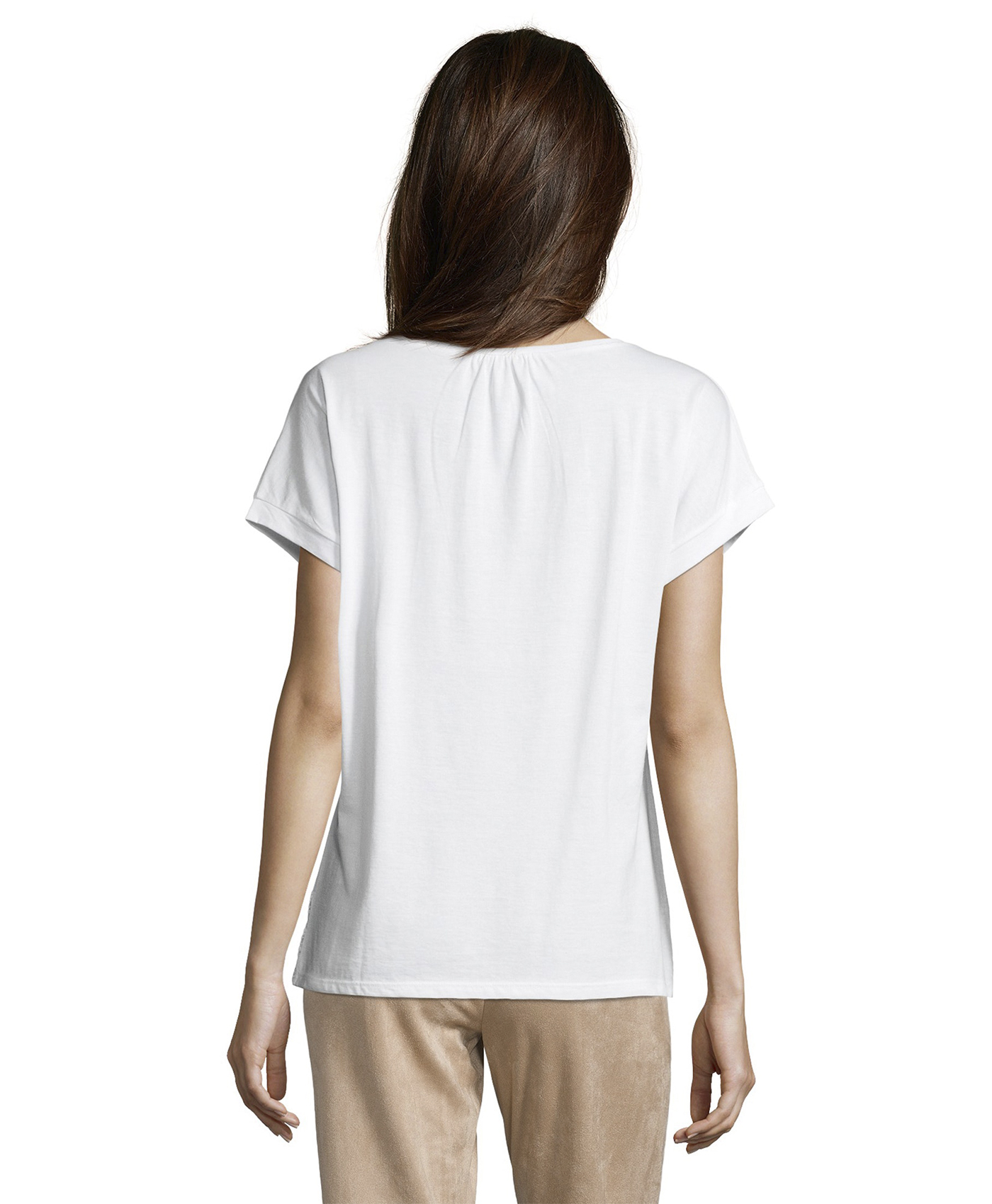 Футболка свободного покроя. Широкая круглая горловина, короткие цельнокроеные рукава. Вышивка с надписью на груди, ажурная отделка по низу. Материал из смеси модала и хлопка приятен к телу и обеспечивает комфорт. Эта модель создает легкий и романтичный образ даже в брючном комплекте.