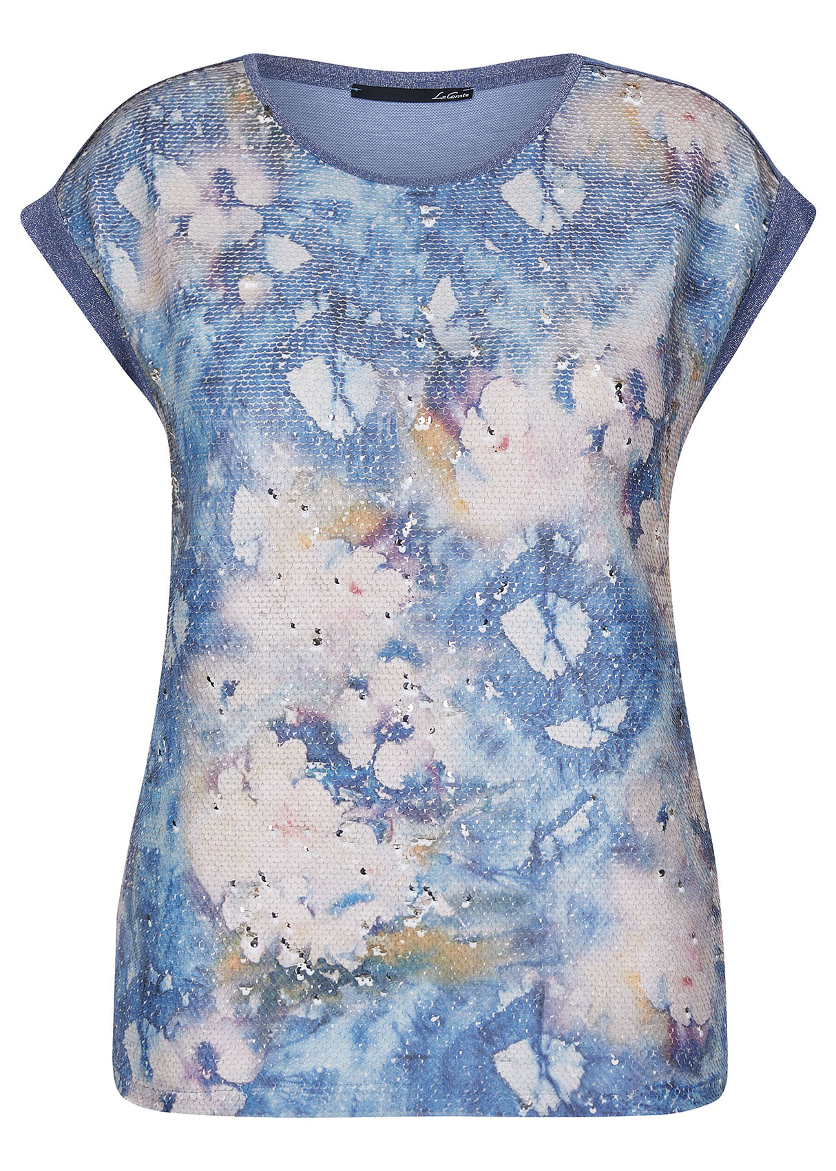 Футболка слегка приталенного силуэта. Декор пайетками по переду изделия, отделка с нитью люрекса. Короткий цельнокроеный рукав. Приятный к телу материал из смеси хлопка и эластана. Длина изделия по спинке: 65 см.