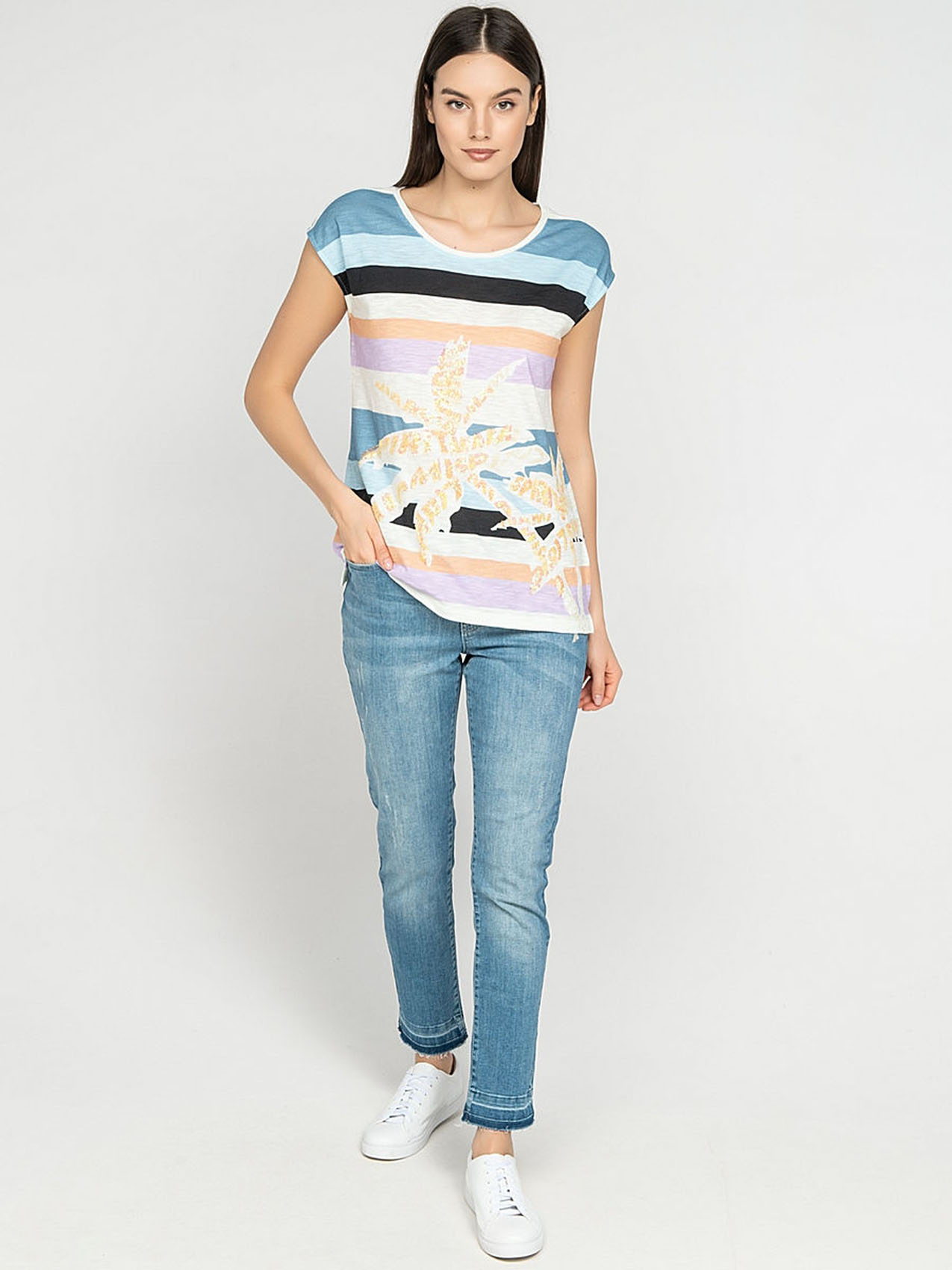 Футболка слегка приталенного силуэта. Круглый вырез, короткие цельнокроеные рукава, небольшие разрезы по бокам. Трендовая полоска. Декор: вышивка пайетками.