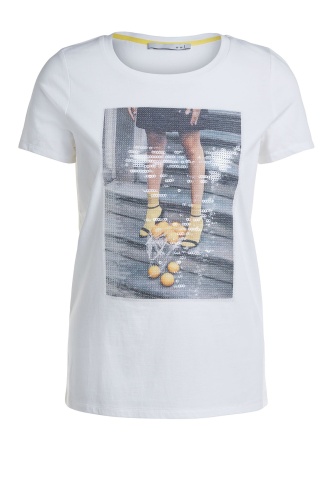 Футболка прямого покроя. Круглый вырез горловины, короткие рукава. Контрастный принт обращает на себя внимание, а пайетки привносят нотку гламура. Хлопковый материал приятен к телу и обеспечивает комфорт. Эта футболка - отличный вариант верха для множества стильных образов.