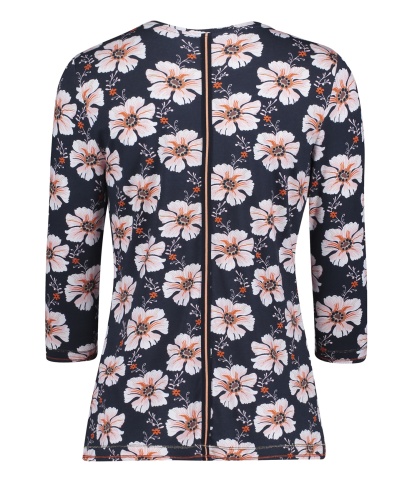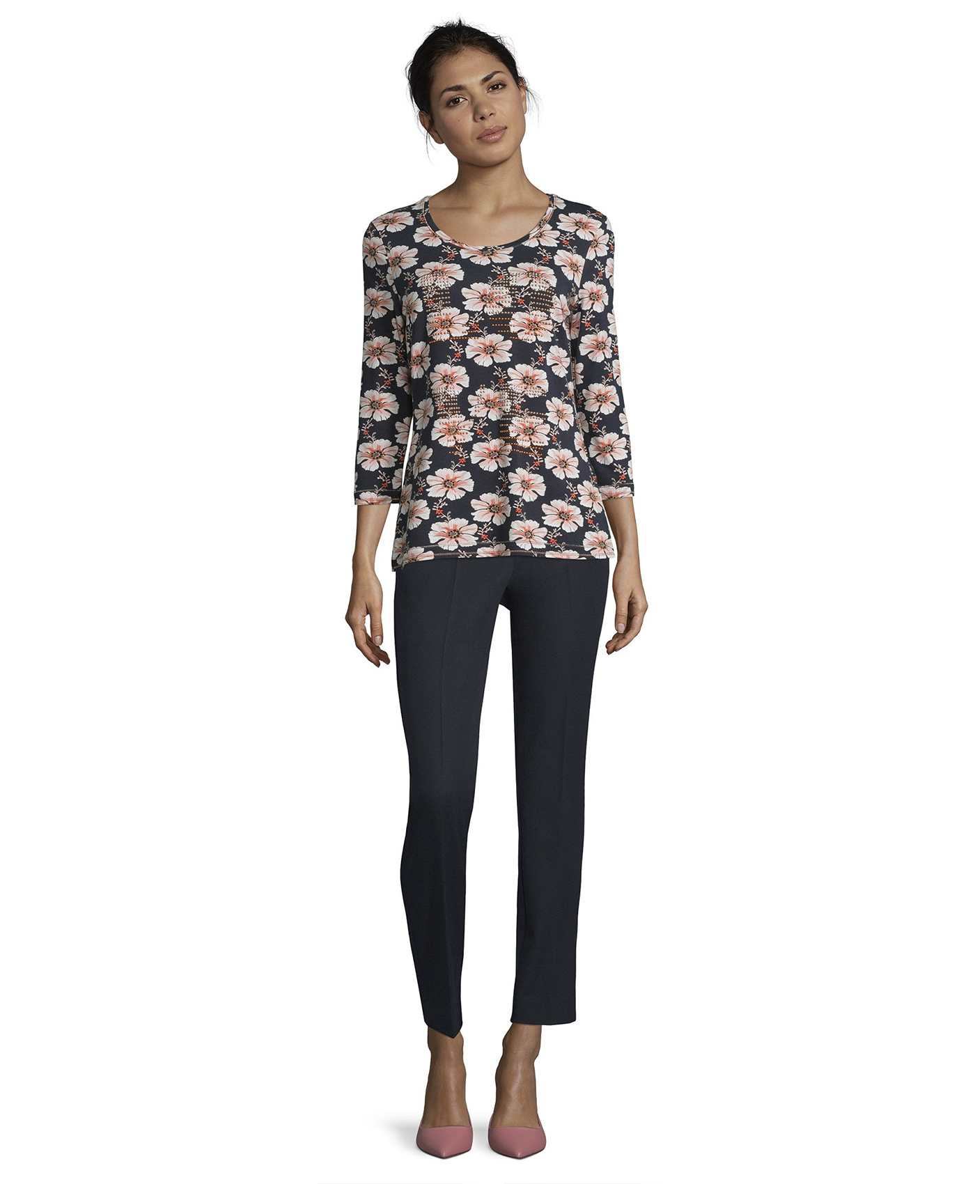 Цветочный принт в тренде! Футболка полуприлегающего силуэта с круглым вырезом горловины и рукавами 3/4. Стразы на груди придают блеск и гламур. Приятный к телу материал из смеси хлопка, модала и эластана обеспечивает комфорт. Эта футболка - отличный вариант верха для создания стильного повседневного образа.