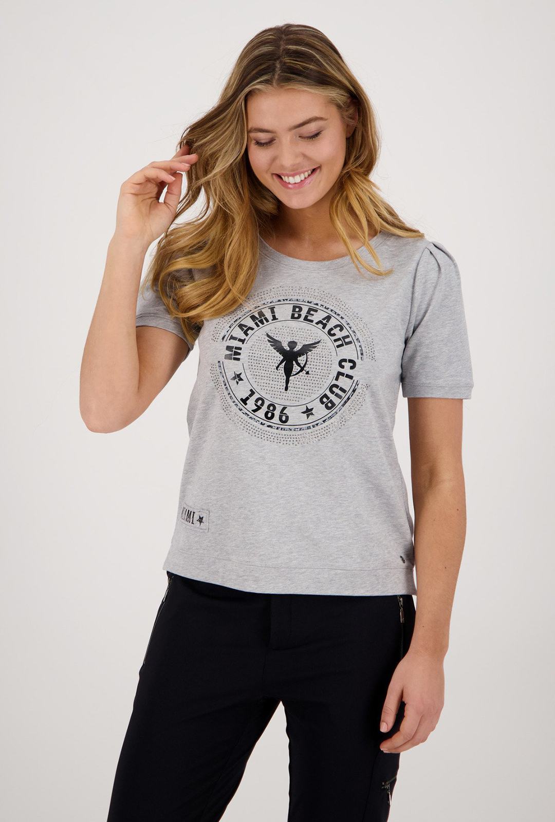На сайте указаны Российские размеры. Серая однотонная футболка с принтом на переде изделия. Принт украшен стразами. Широкий овальный вырез горловины. Короткий втачной рукав со сборками.
