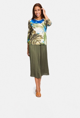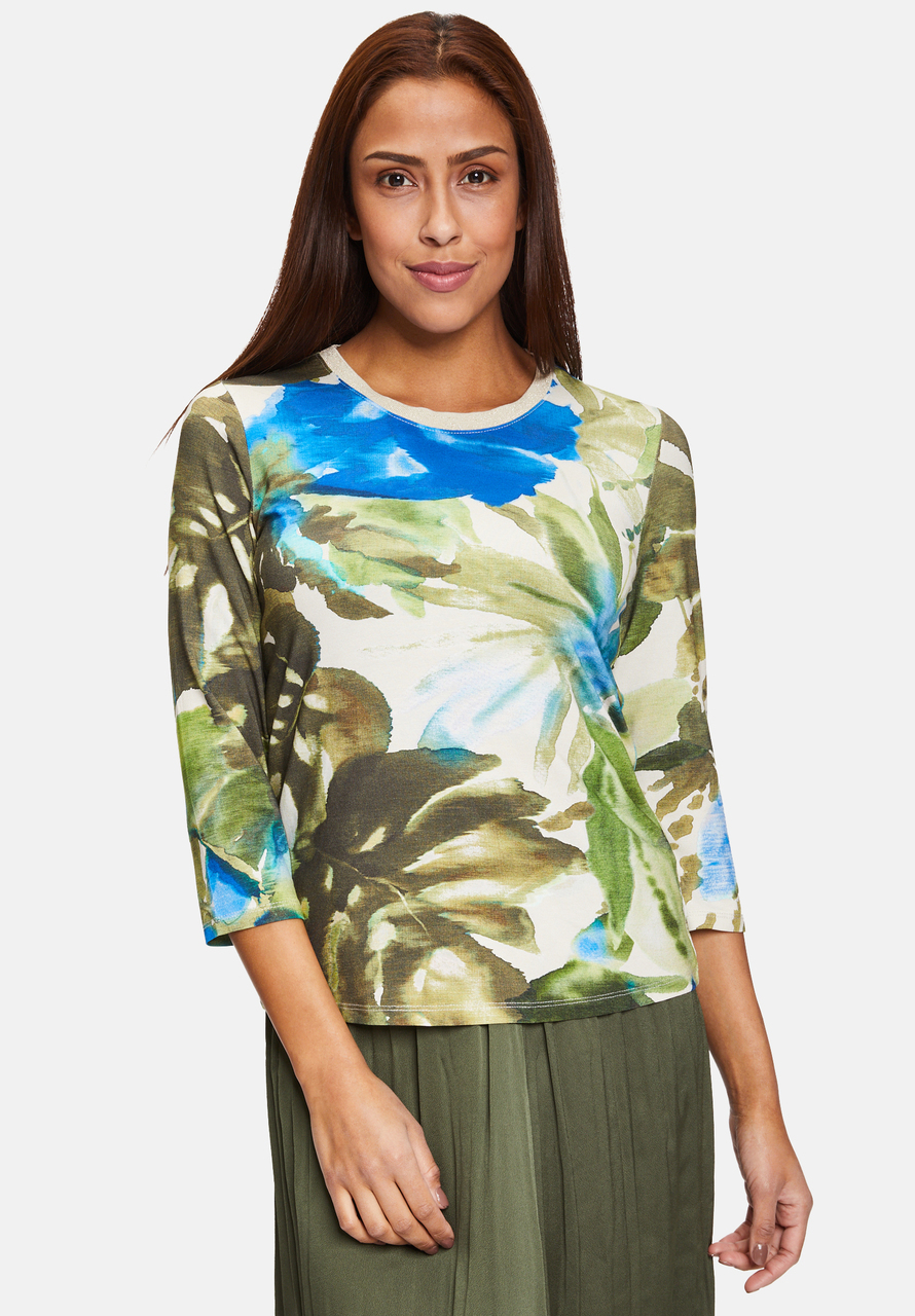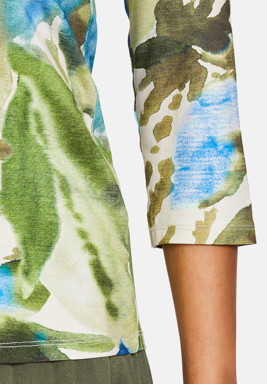 Базовая рубашка с принтом. Приталенный крой и материал из вискозы обеспечивают удобную посадку верха. Рукава 3/4. Длина 64 см.