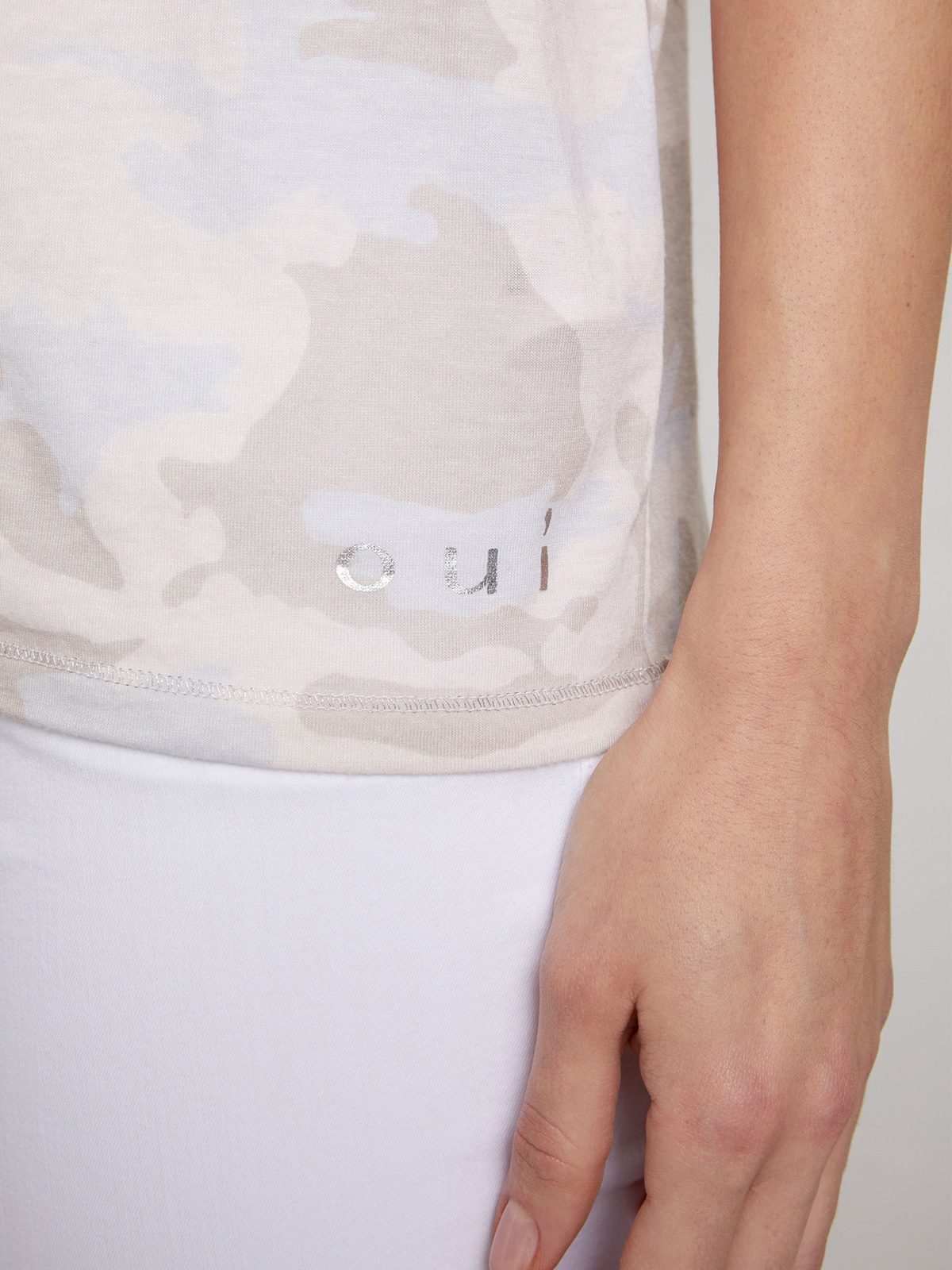 Футболка в нежной расцветке может быть самостоятельным верхом или надеваться под блейзер или жакет. Короткий втачной рукав, V-образный вырез горловины.