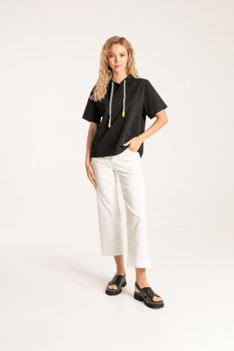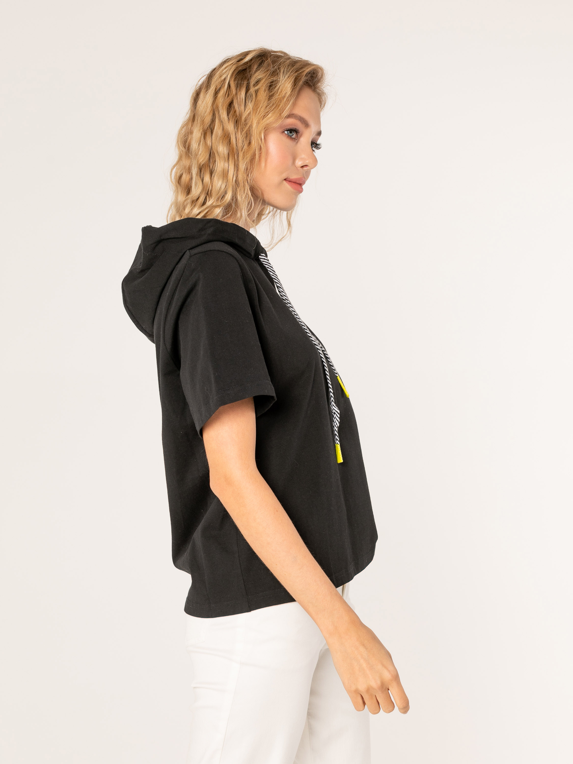 Футболка-худи средней длины прямого силуэта из легкого 100% хлопка. На спинке выполнен принт в виде радуги. Укороченные втачные рукава. Капюшон с полосатыми шнурами и желтыми наконечниками.