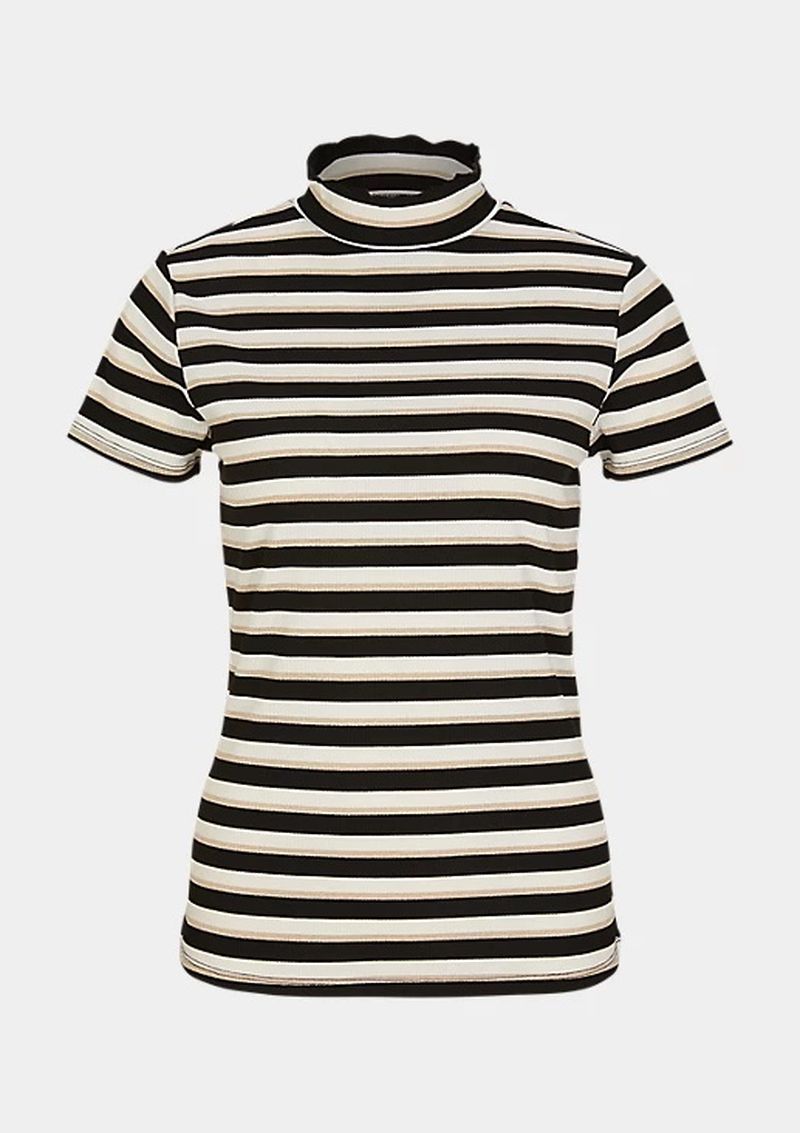 Футболка в широкую полоску – отлично выглядит как самостоятельный верх, так и в комплекте с пиджаком. Короткий втачной рукав, воротник-стойка с оборками.