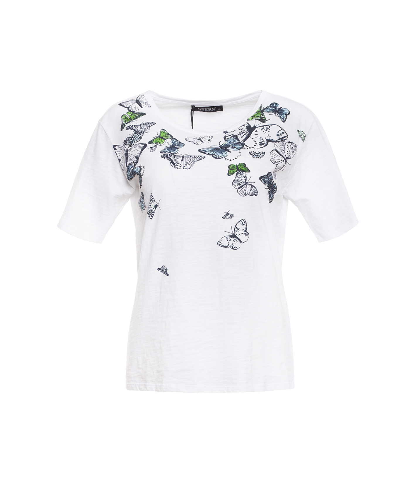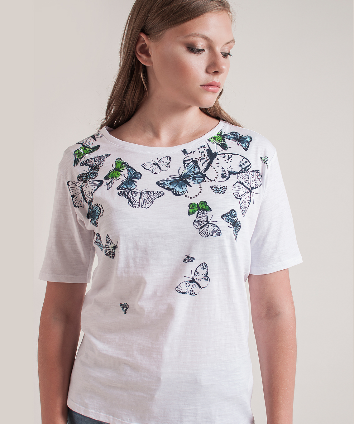Футболка прямого покроя. Вырез горловины "лодочка". Принт с изображением бабочек подчеркивает нежный образ.