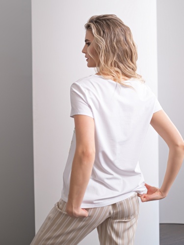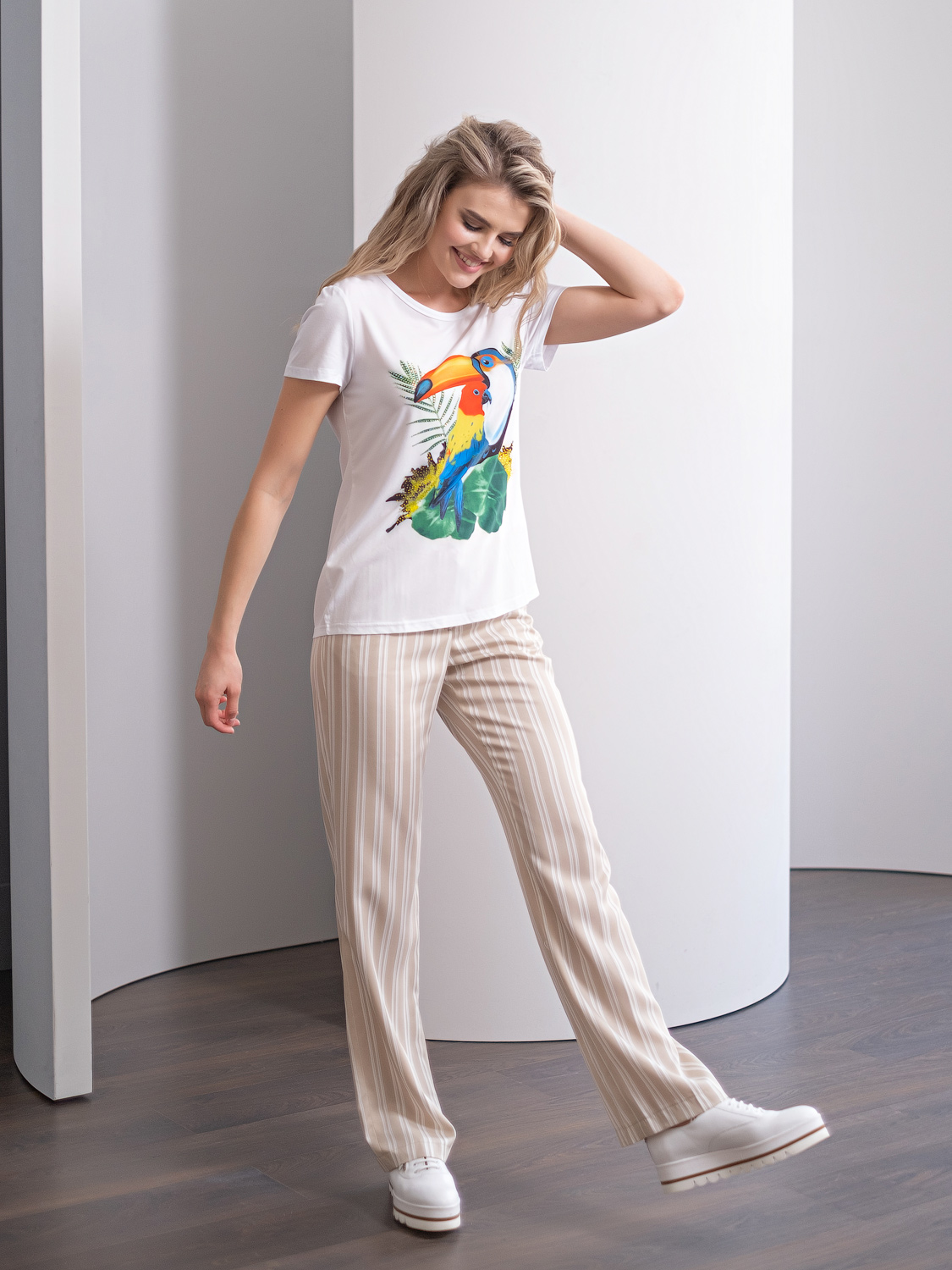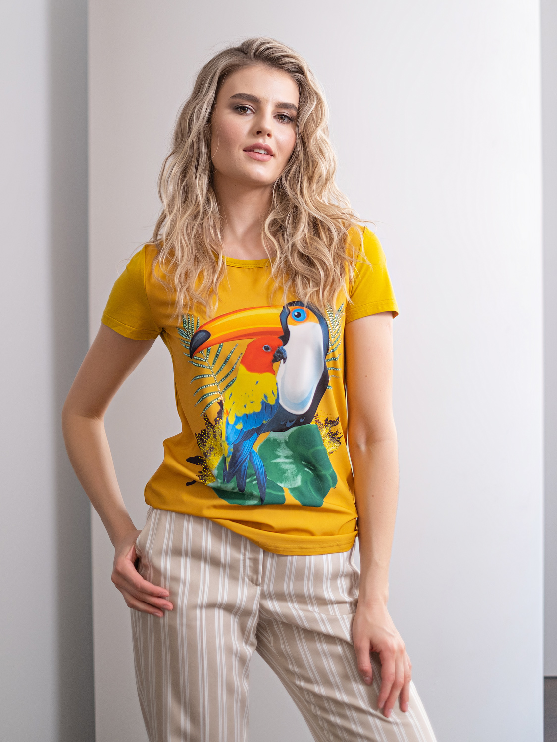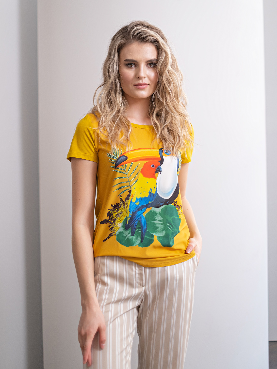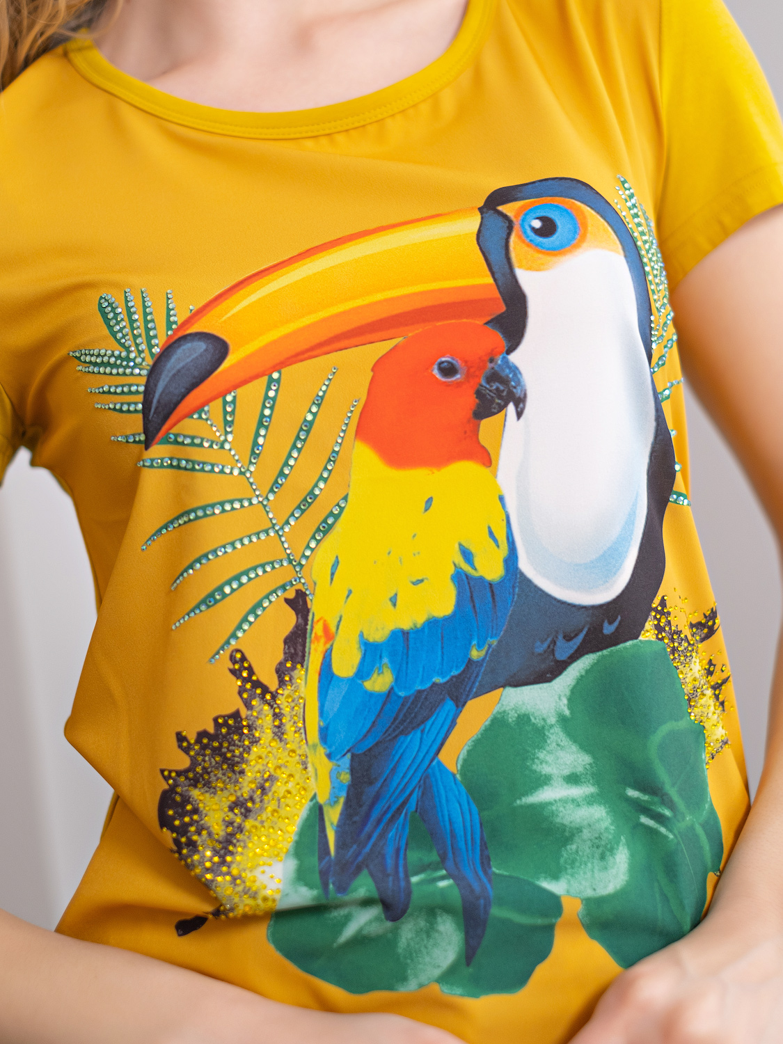 Футболка из приятной на ощупь ткани. Натуральные материалы в составе изделия обеспечат комфорт и прохладу жарким летом. Круглый вырез горловины создаст женственный образ. Посадка по фигуре. Модный в новом сезоне принт с тропическими птицами подчеркнет чувство вкуса обладательницы футболки. Данная модель будет прекрасно сочетаться как с брюками, так и с юбкой.