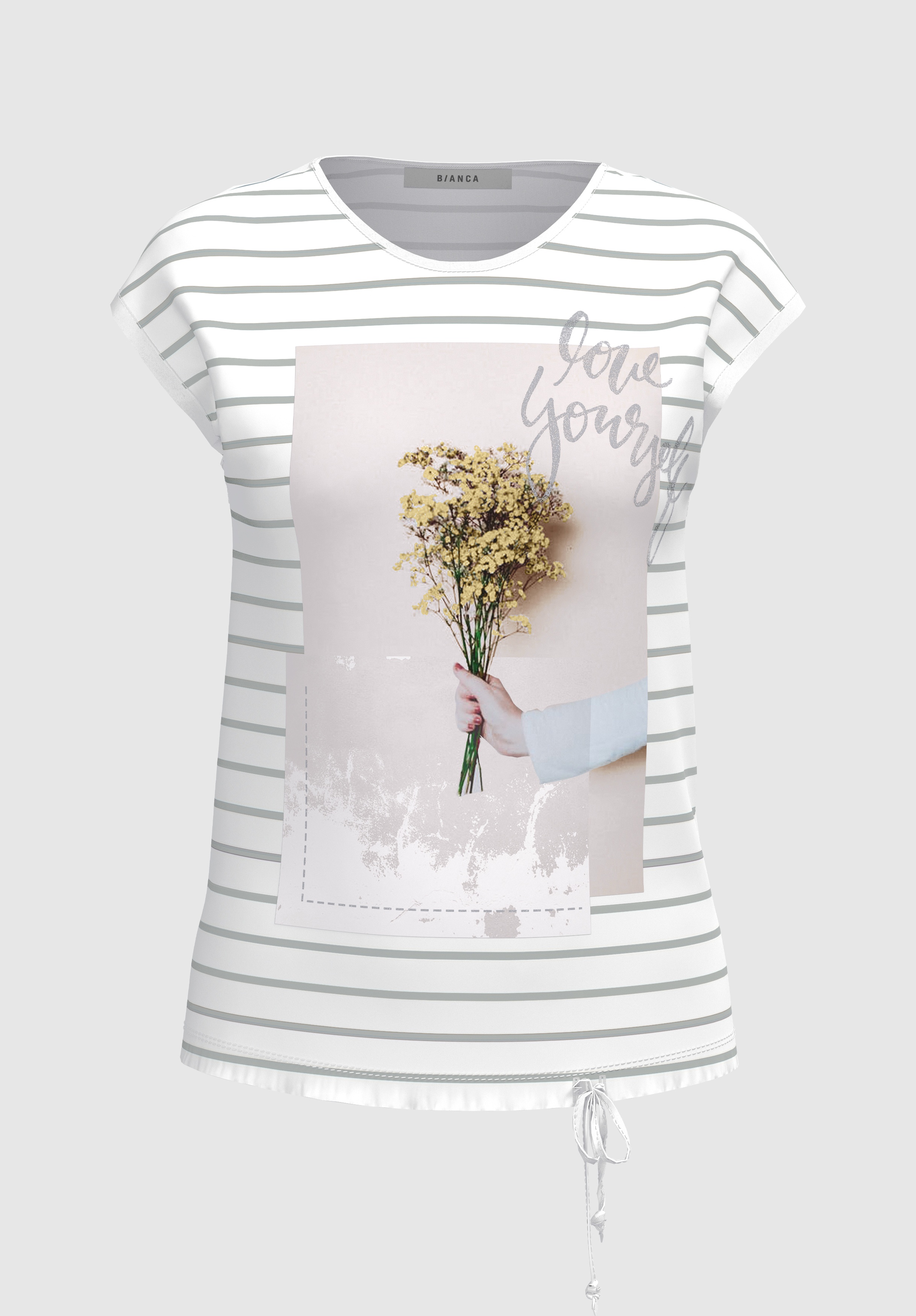 Футболка с принтом, круглым вырезом и объемными рукавами. Атласная отделка спереди, трикотаж сзади. Кулиска с завязками на кромке.