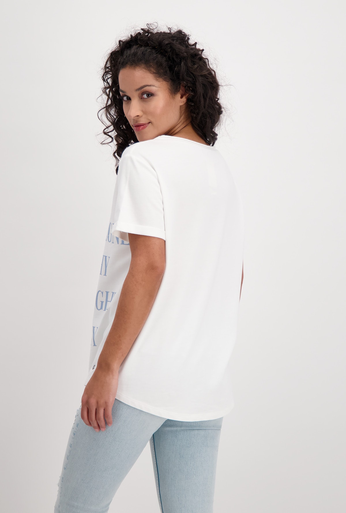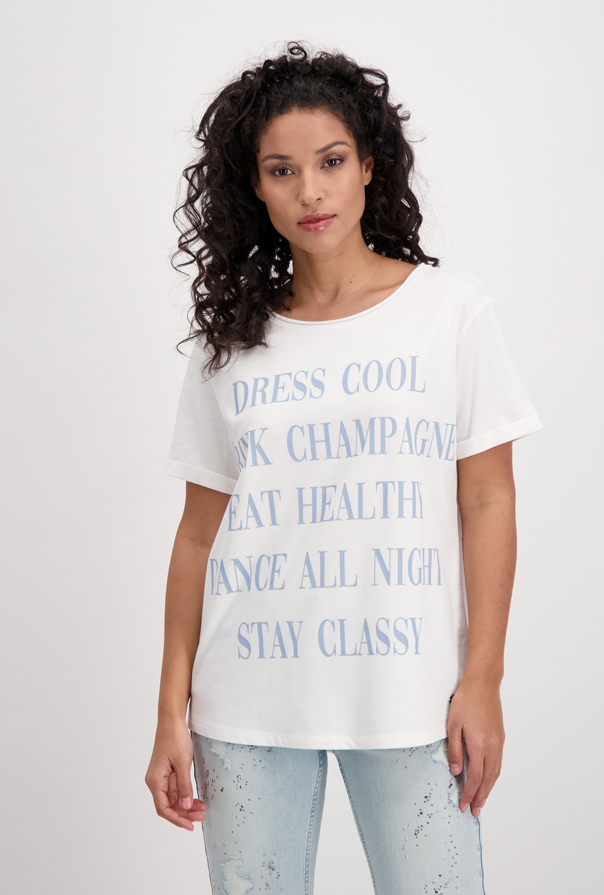 На сайте указаны Российские размеры. Футболка с короткими рукавами и круглым вырезом. На передней части футболки изображен крупный стильный текст. Прямой крой с подвернутыми концами рукавов, круглый вырез горловины с подвернутым краем и блестящим оверлочным швом с люрексом, а также удлиненная спина с закругленным низом. Параметры модели: 42 размер, рост 174 см