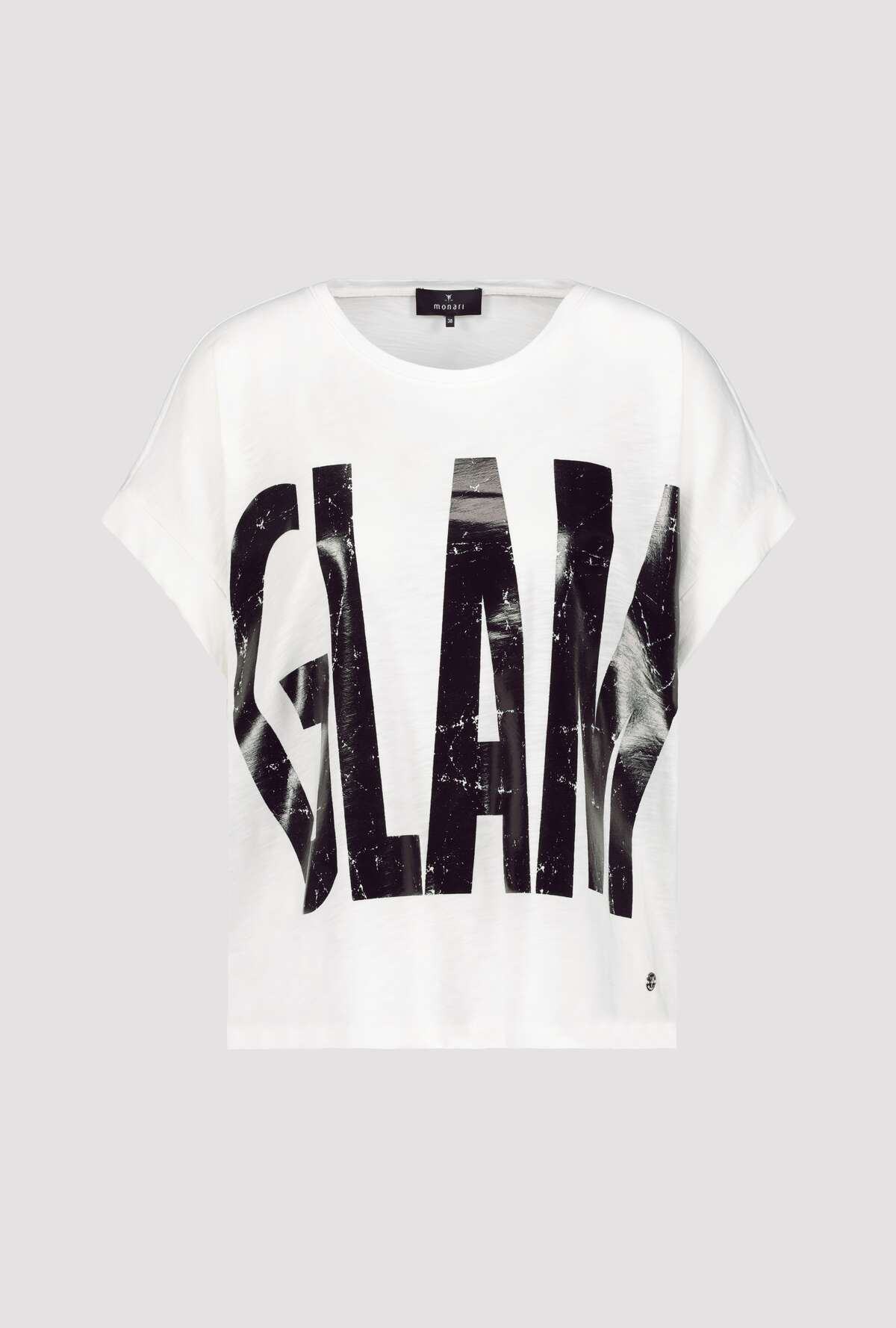 На сайте указаны российские размеры. Рубашка из тонкой пряжи с круглым вырезом и крупным принтом. Крупная виниловая надпись на джерси из тонкой пряжи придает рубашке с круглым вырезом выразительный вид. Модель ростом 179 см Длина платья 60 см