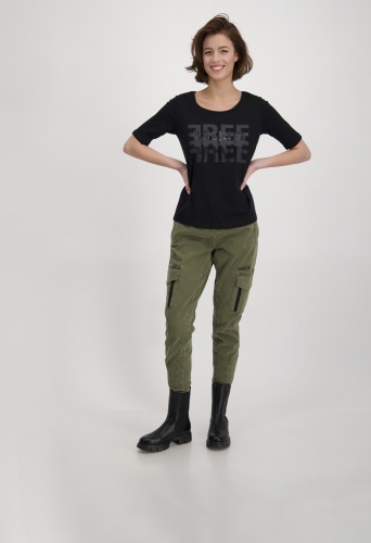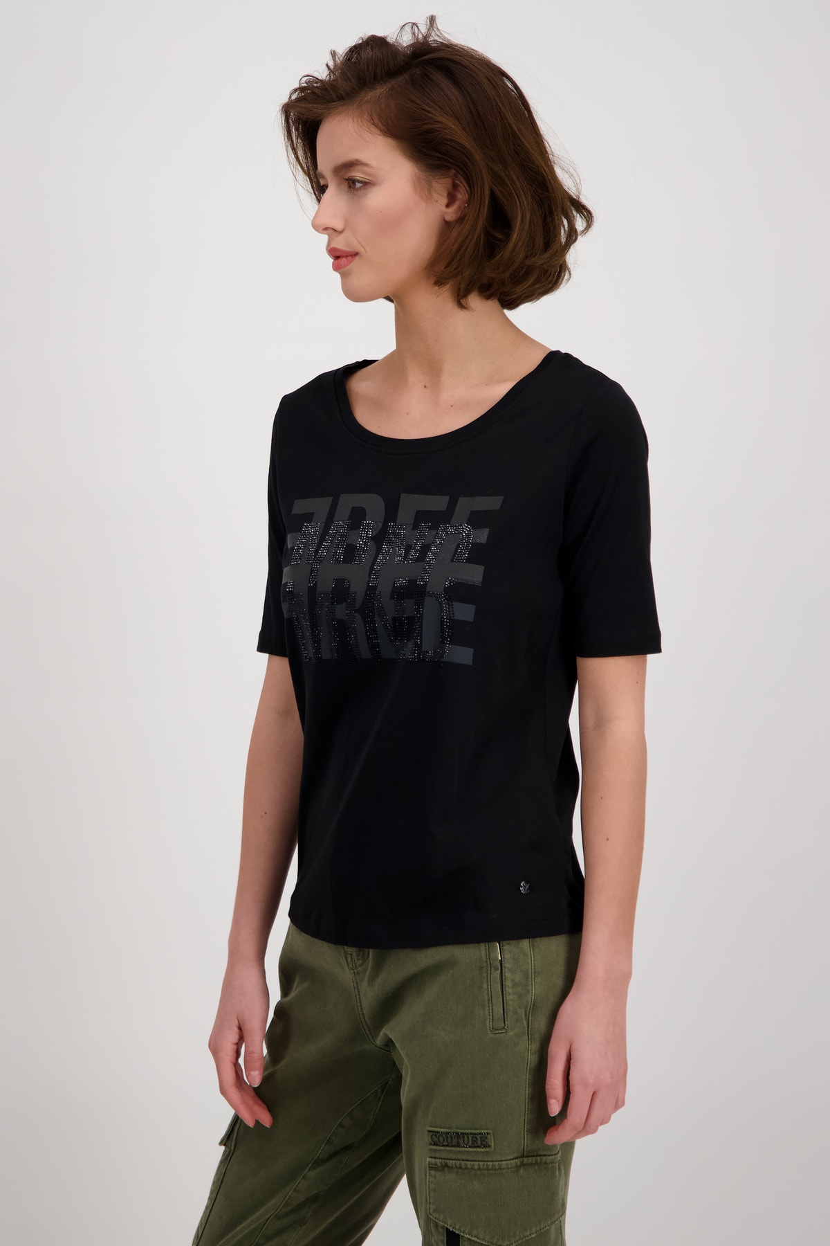 На сайте указаны российские размеры. Легкая футболка из джерси с короткими рукавами и стразами. Прямой крой с небольшой вставкой на круглой горловине и закругленным низом. Детали: перед с гламурным шрифтом из блестящего лакового принта и сверкающих страз. Качество: изготовлено из высококачественного хлопка с примесью модала. Идеально подходит для бесчисленных образов. Сочетайте рубашку с приятным комфортом при ношении по своему желанию! Модель ростом 178 см. Длина спины 44 размера 64 см.