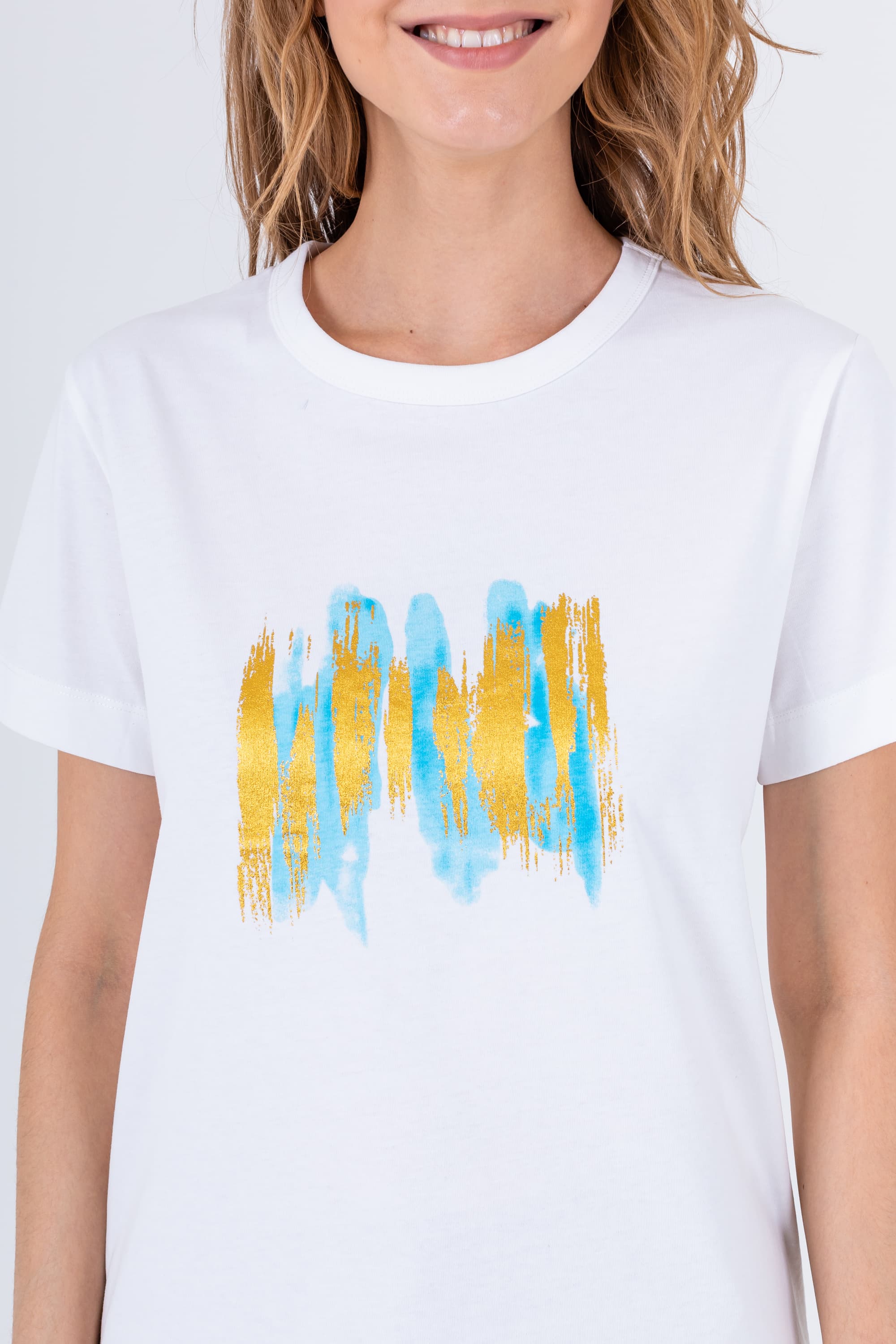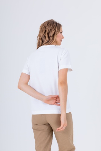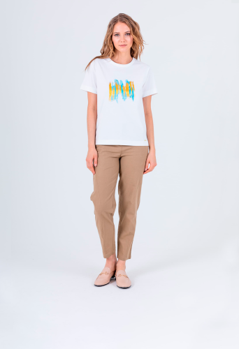 На сайте указаны российские размеры. Футболка средней длины прямого силуэта из легкого 100% хлопка. По переду выполнен яркий принт. Укороченные втачные рукава. Круглый вырез горловины.