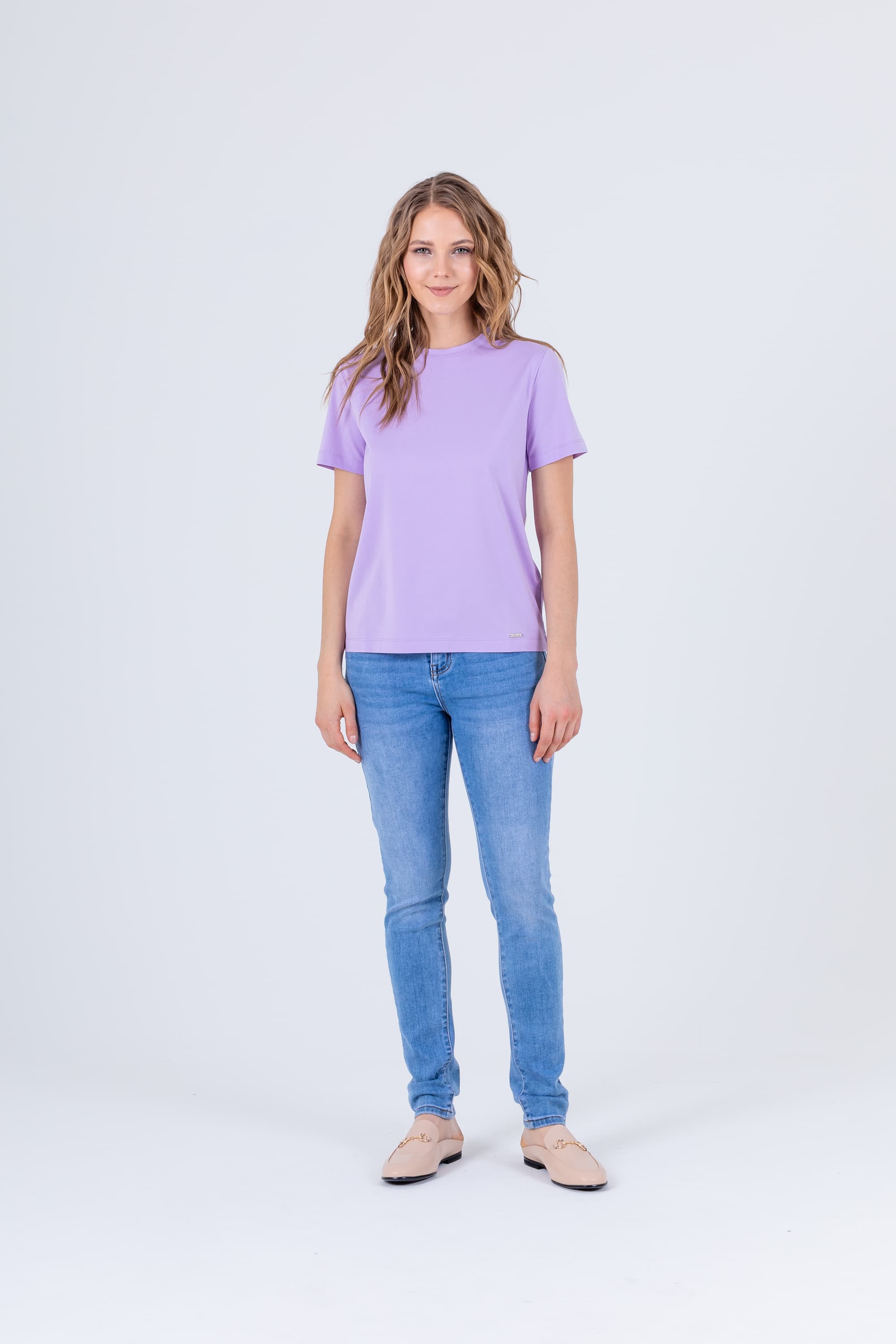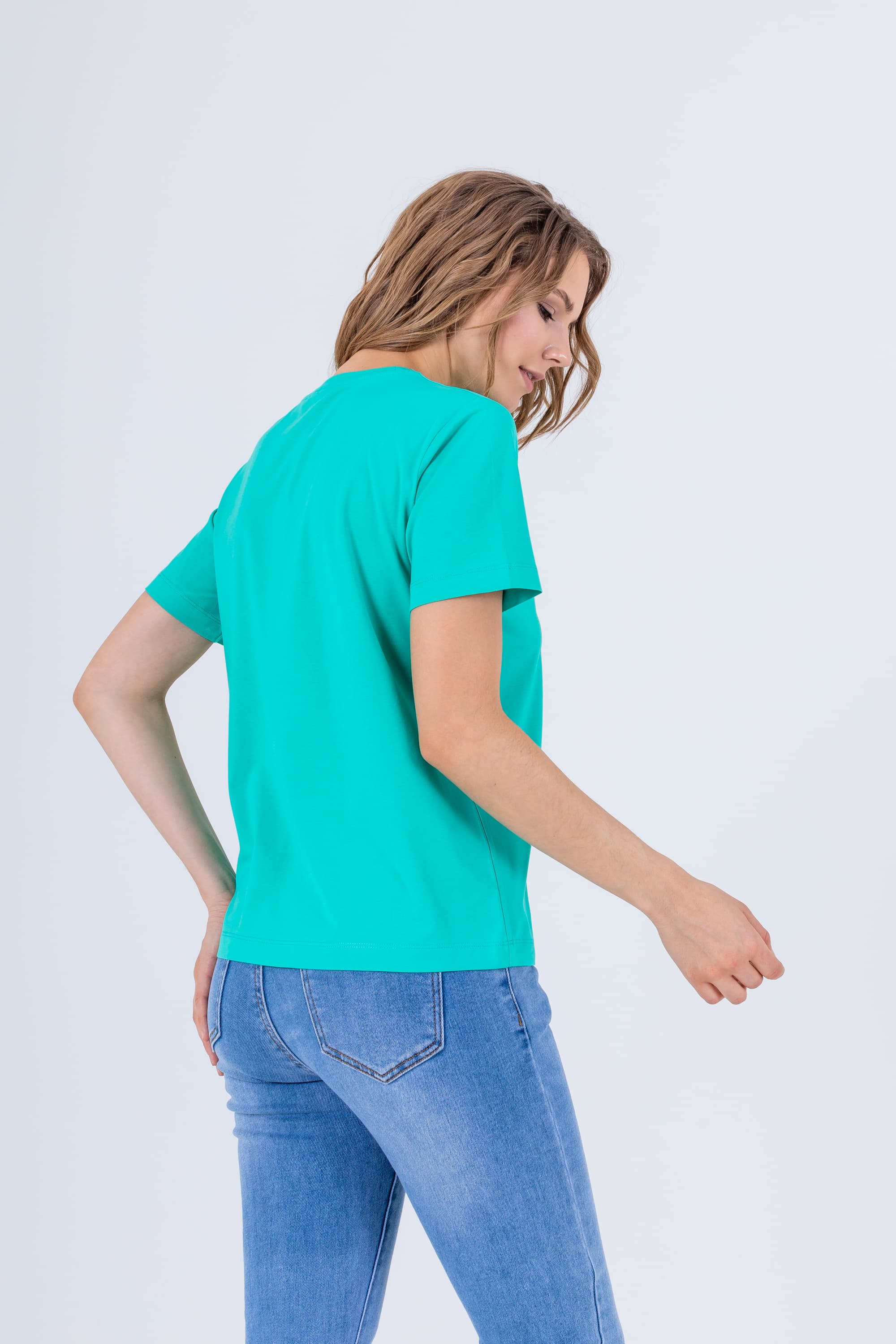 Яркая футболка средней длины прямого силуэта из легкого хлопка, мягкой вискозы и с добавлением эластана. Укороченные втачные рукава. Круглый вырез горловины.